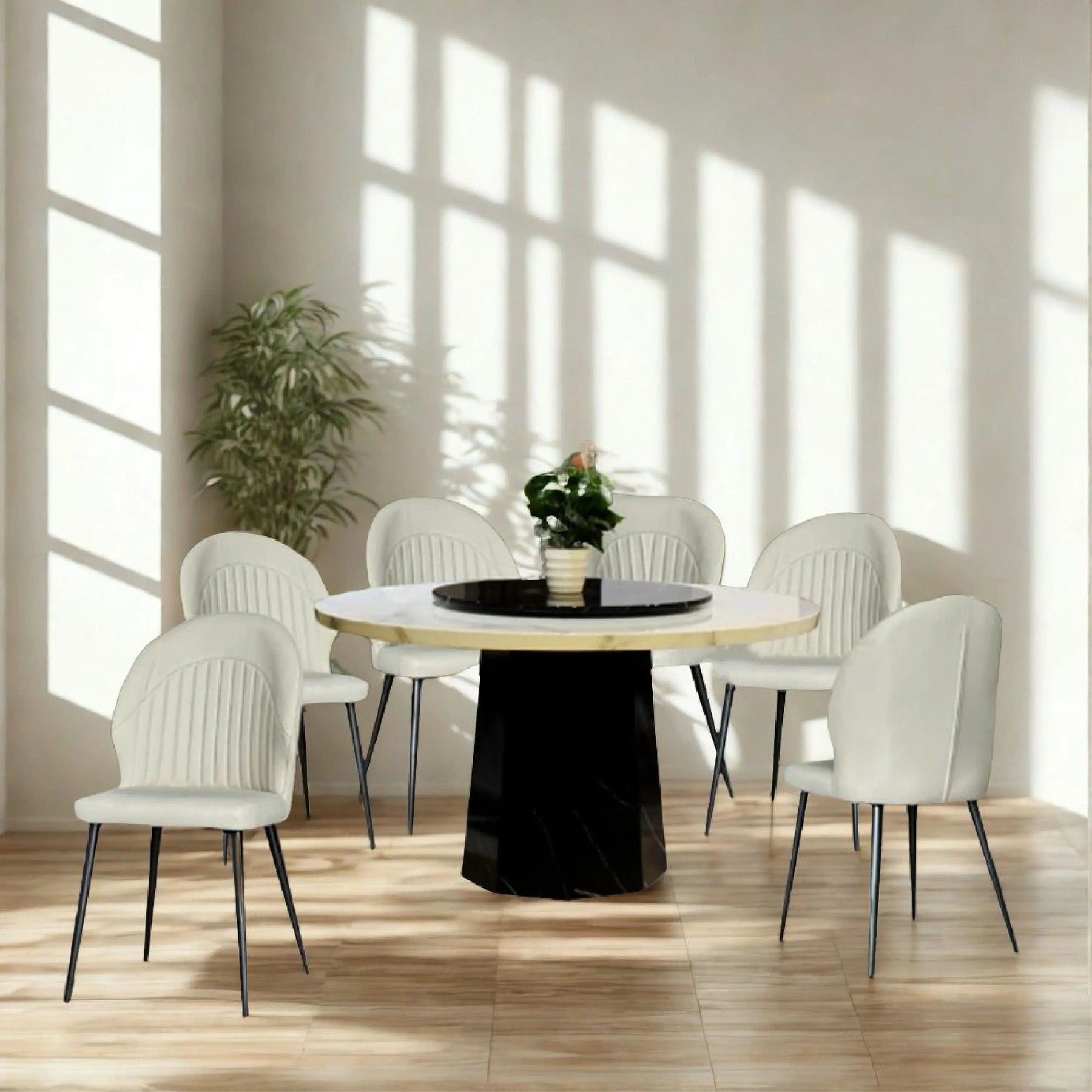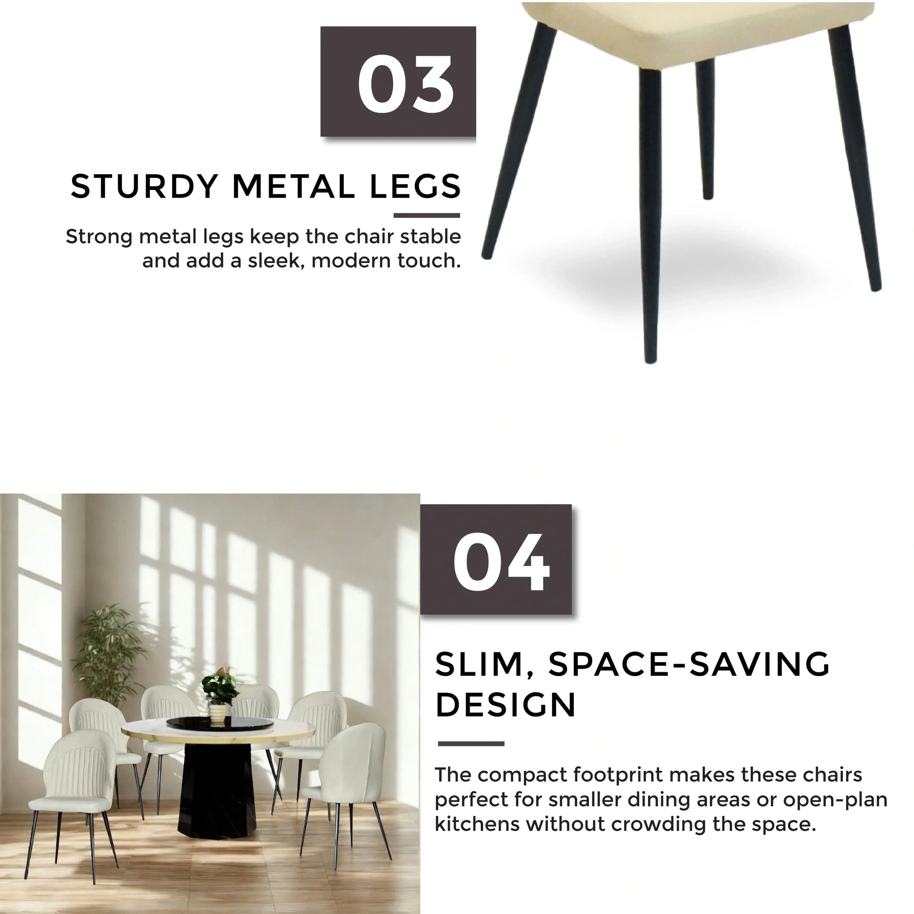 Set of beige dining chairs with PU seat and metal legs styled around a modern round dining table in a bright space.