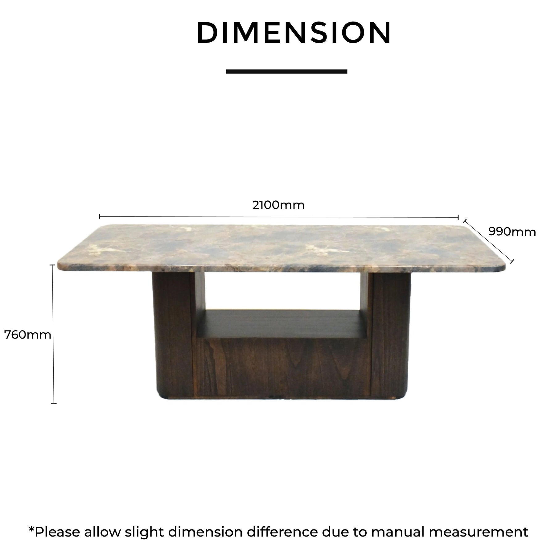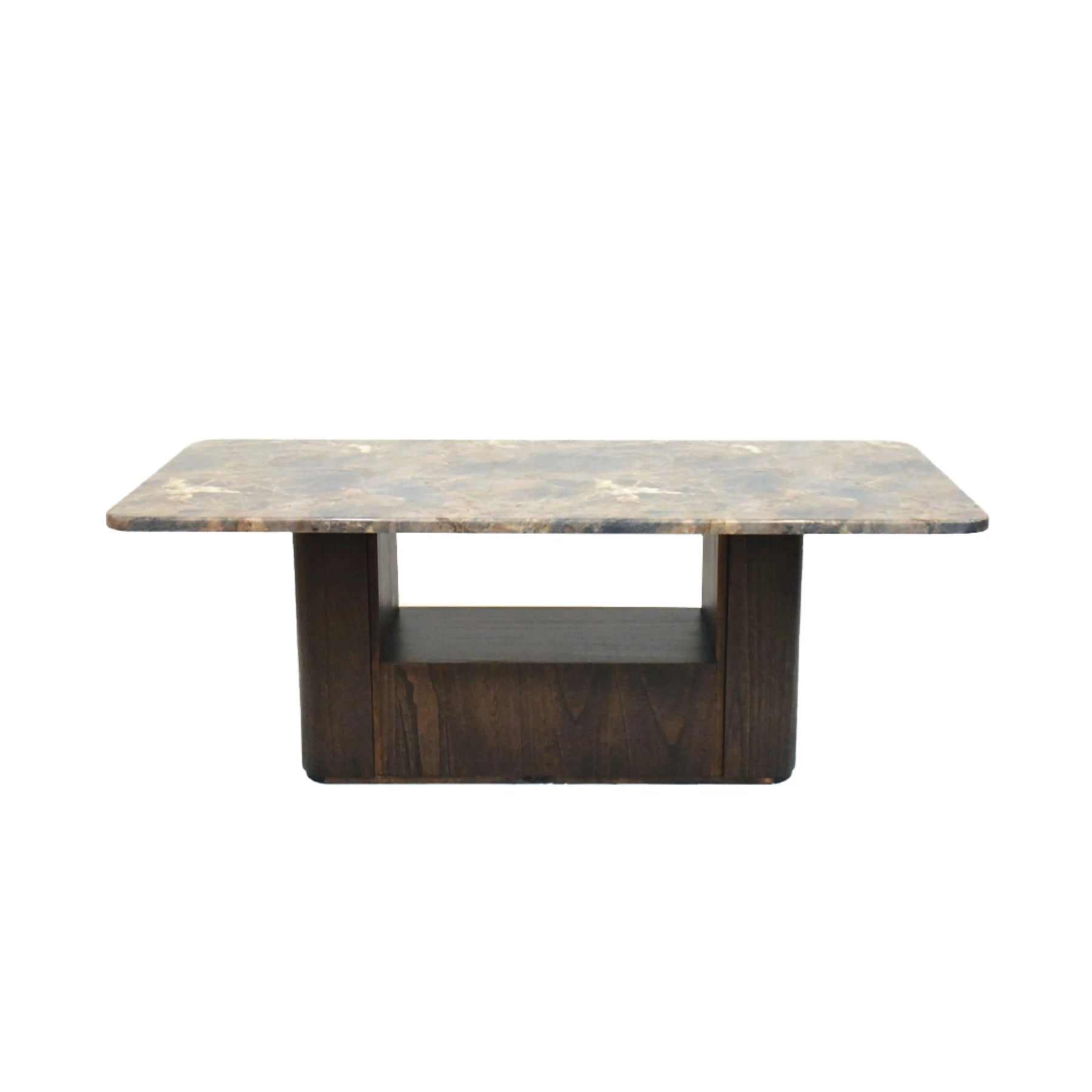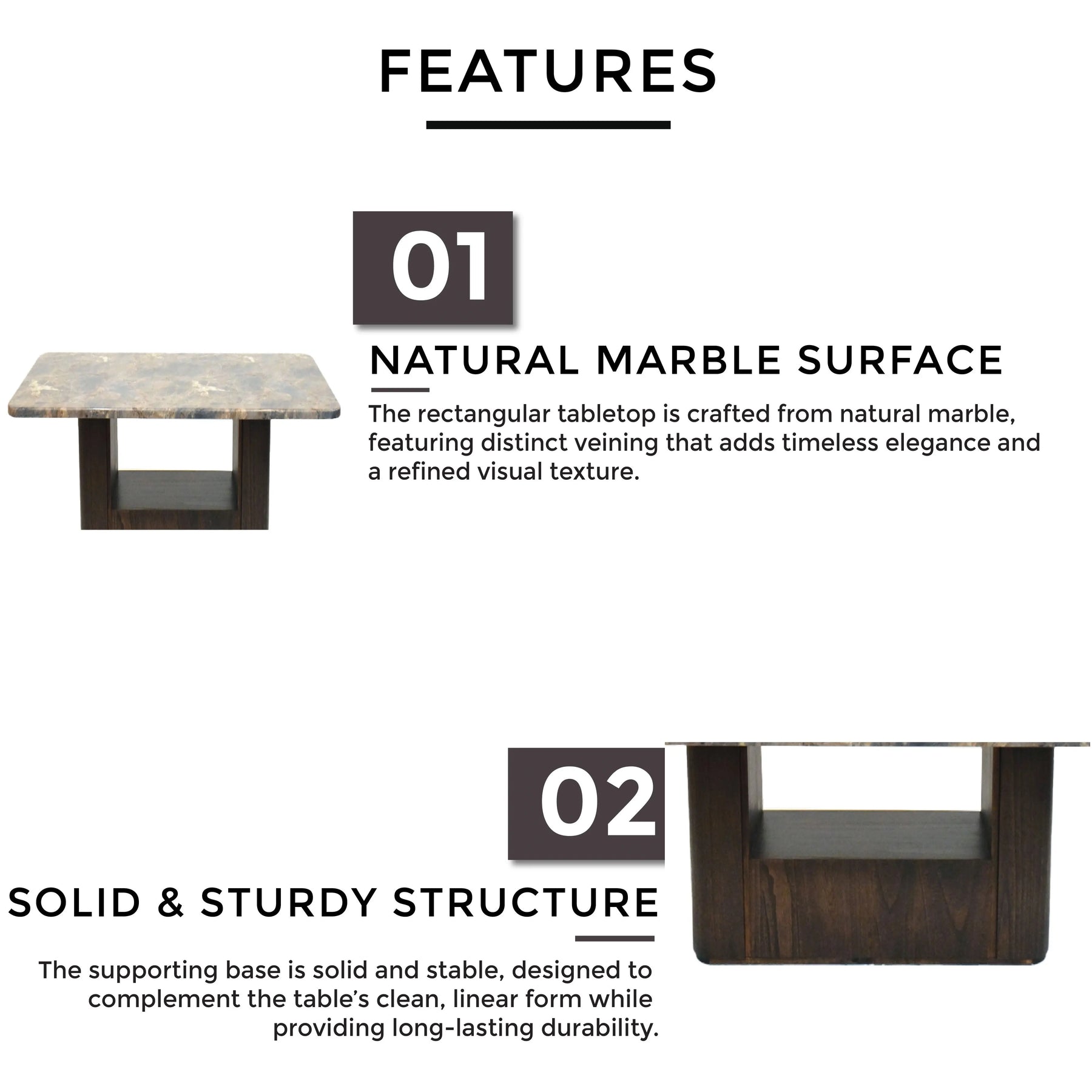 -As shown in photo (rectangular marble top with natural veining and matching solid base)