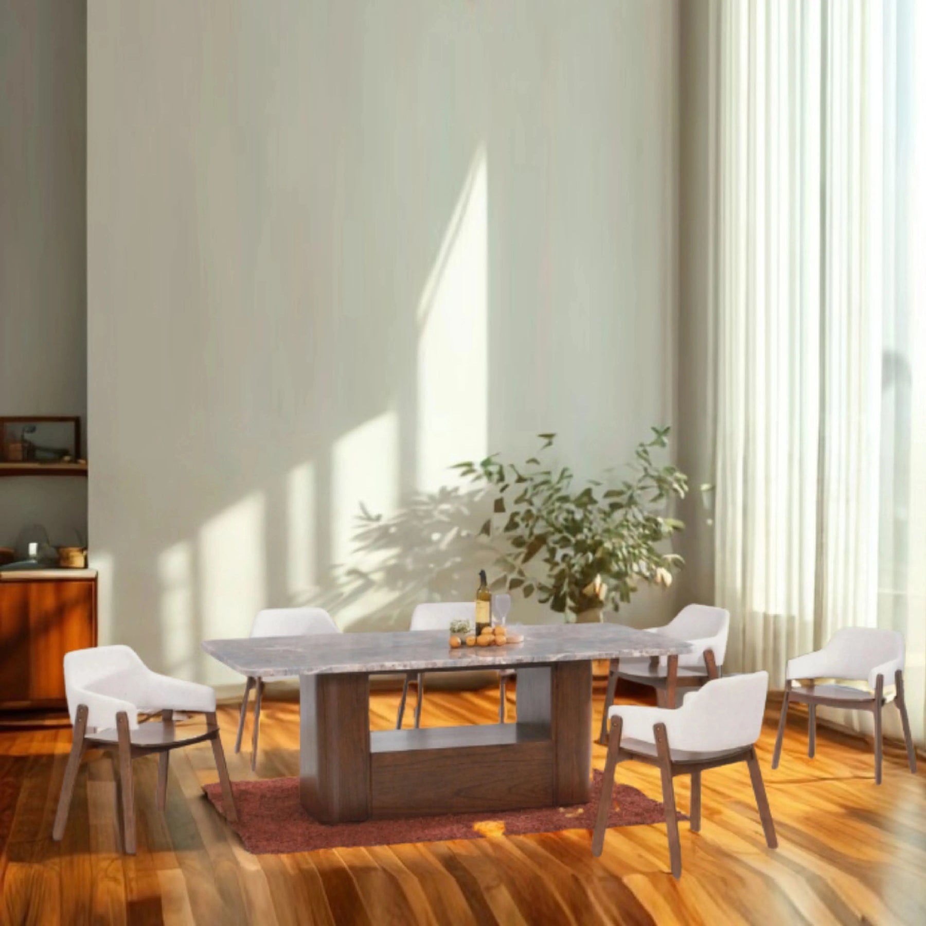 The INYA Marble Dining Table brings refined sophistication to your dining room. Its natural marble surface showcases rich veining, creating a statement piece that effortlessly complements both minimalist and modern interiors. With clean lines and a timeless aesthetic, this table becomes the focal point of any dining setting.