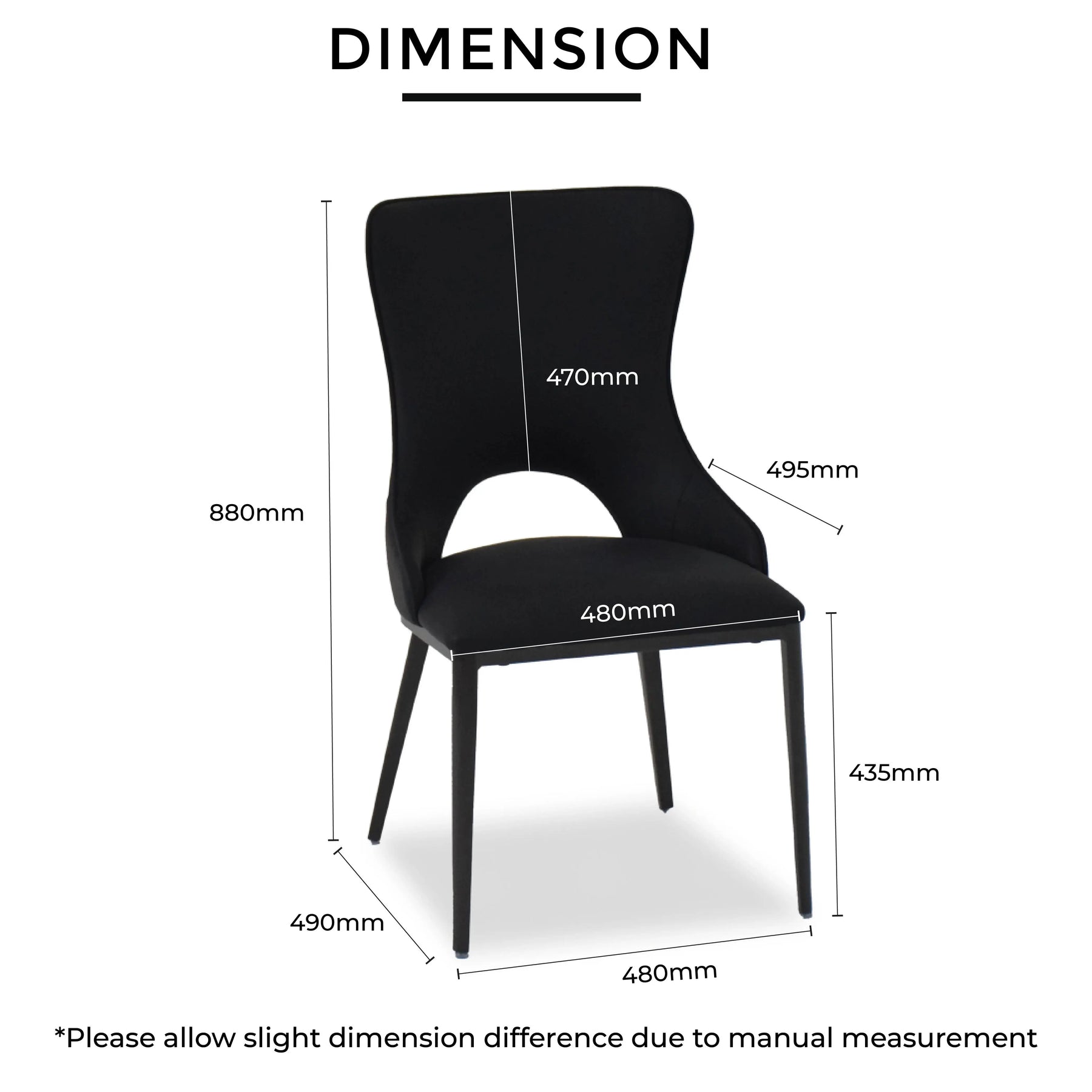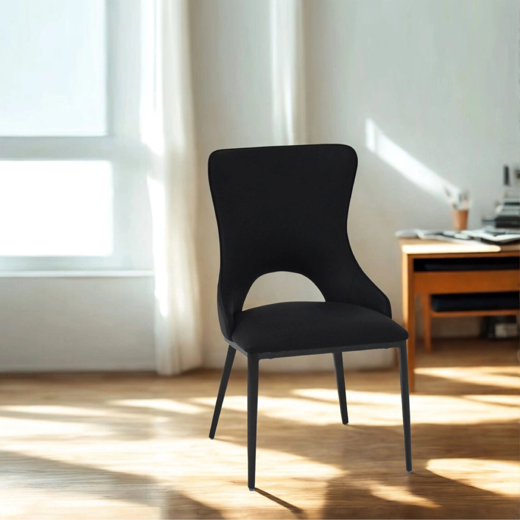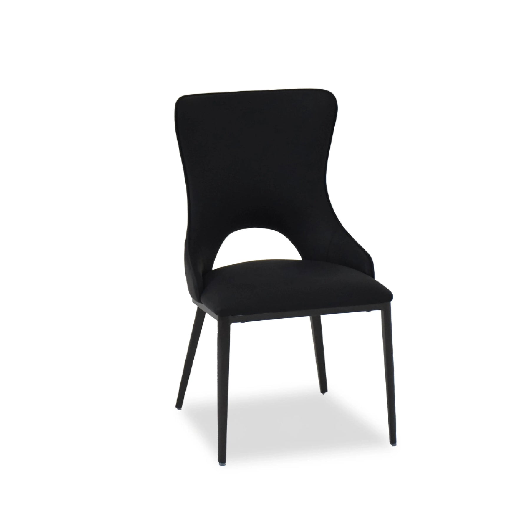 The KENNY Dining Chair showcases a bold silhouette with smooth black PU leather upholstery that enhances any dining space. Its unique wide backrest with a half-moon cutout creates a sleek and contemporary look while ensuring visual appeal. Designed with attention to detail, this chair adds a statement of elegance and modern charm to your dining area or workspace.