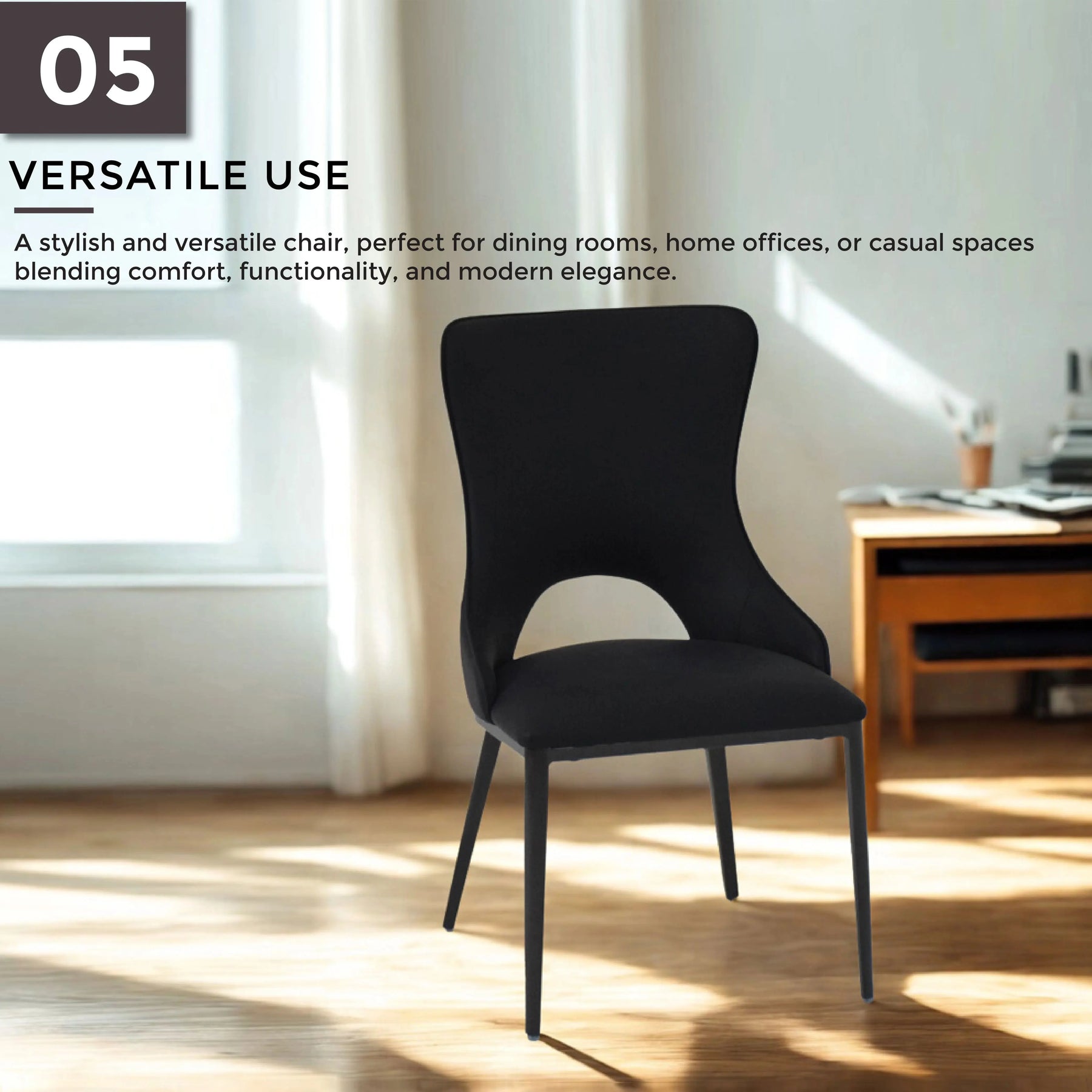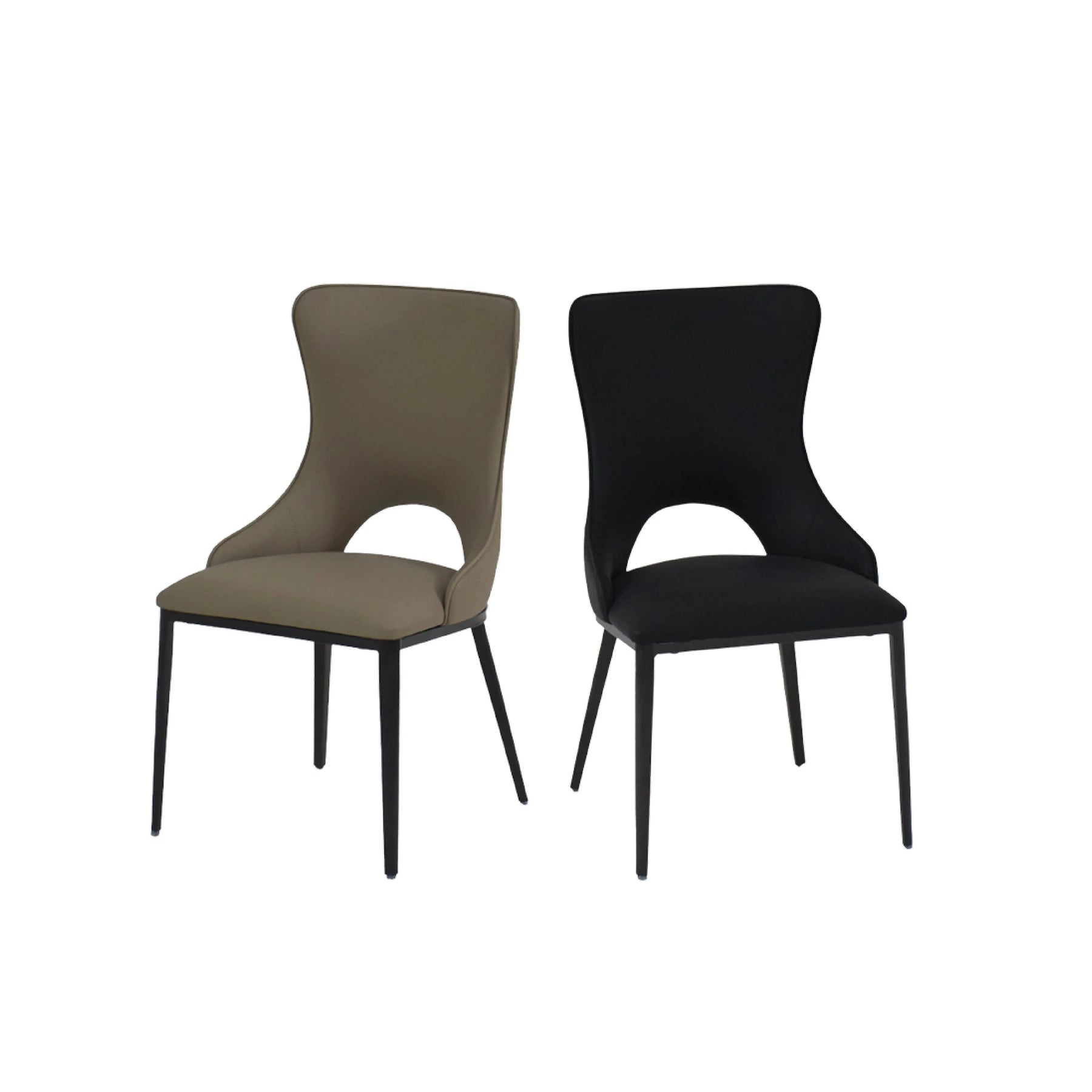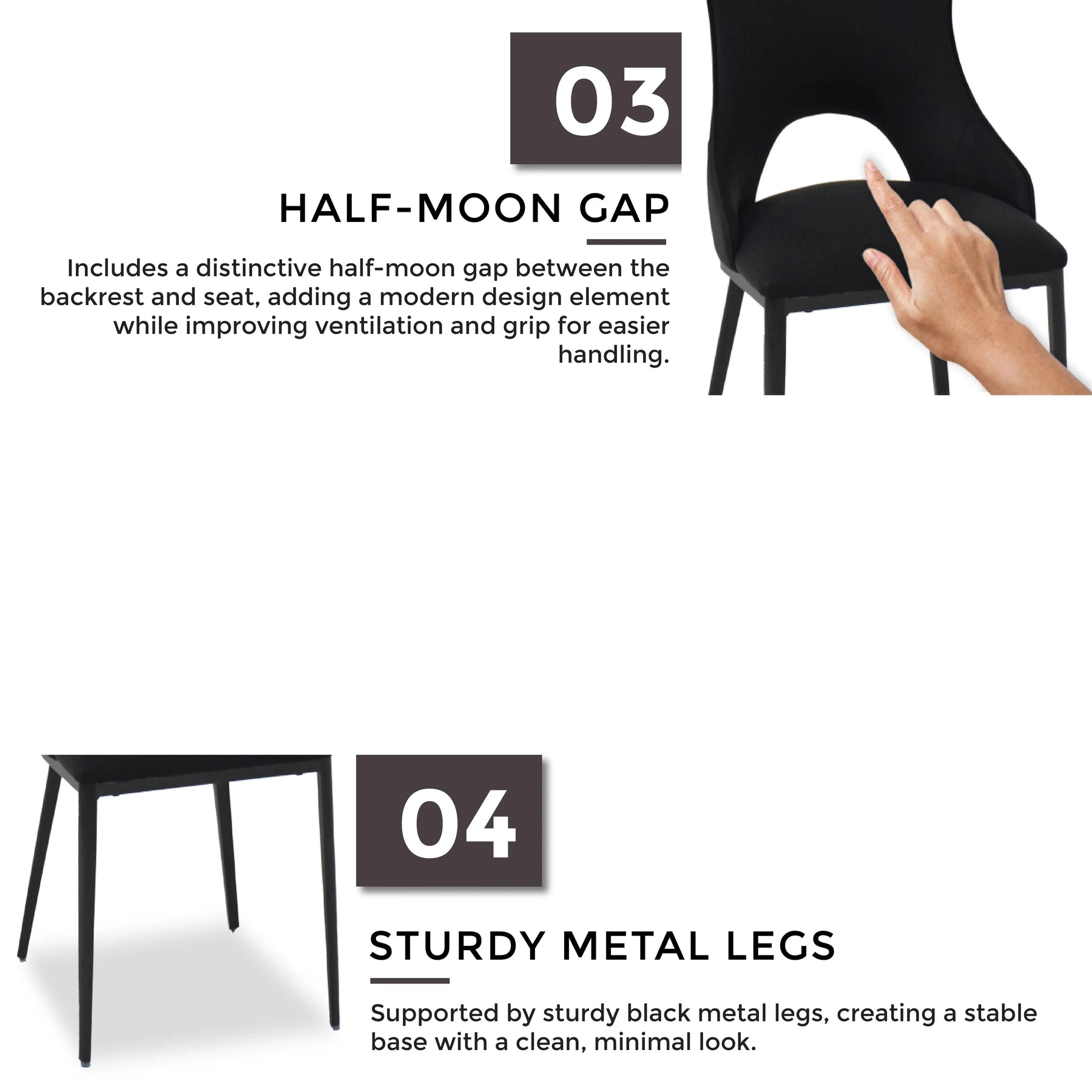 Ergonomically designed, the KENNY Dining Chair provides excellent back support through its cushioned PU surface and wide backrest. The half-moon opening allows for ventilation and adds a lightweight feel, making it comfortable for long hours of sitting. Whether used for everyday dining, working, or hosting guests, this chair combines coziness with functionality.
