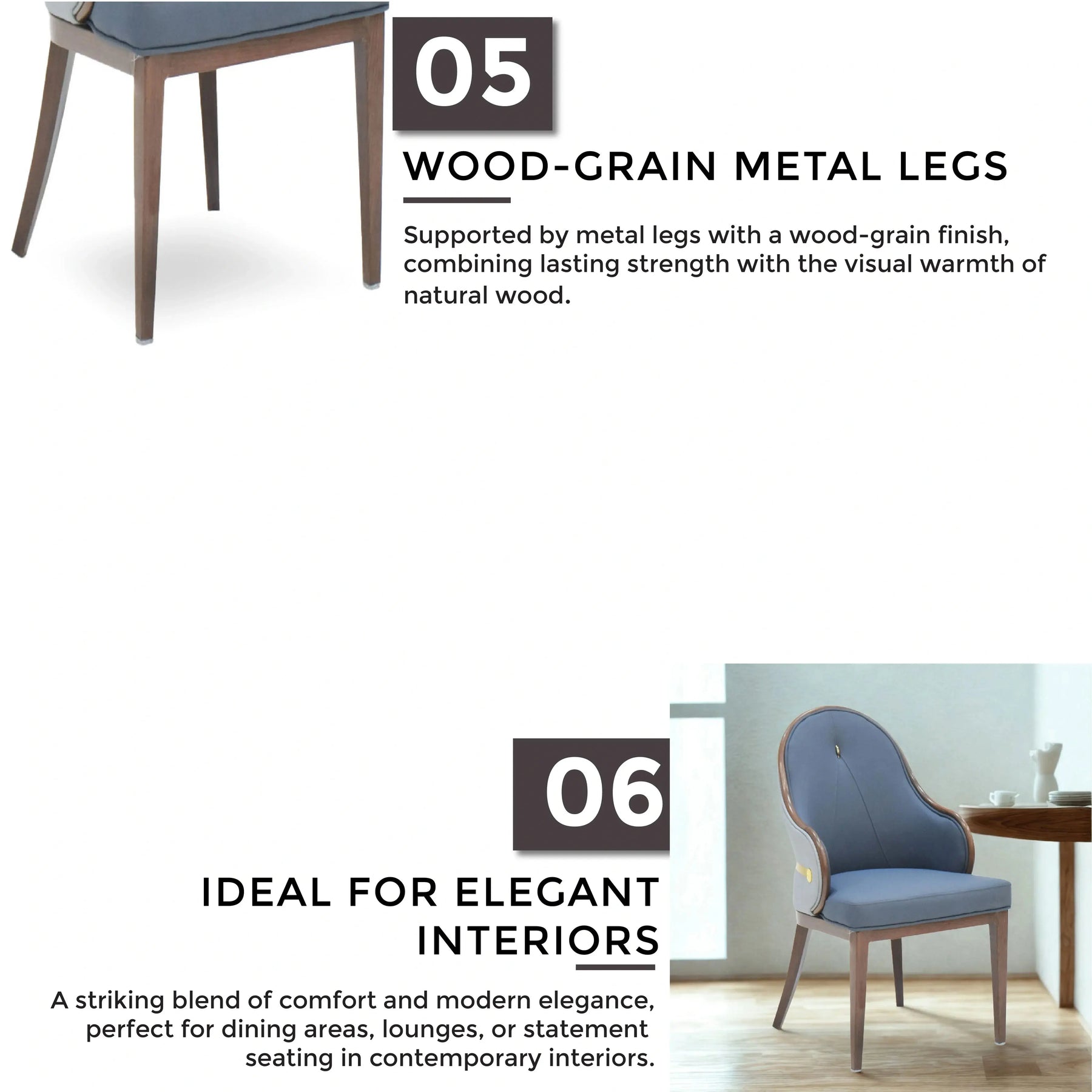 - Built with a wooden frame and strong metal dining chair legs for stability and long-lasting use