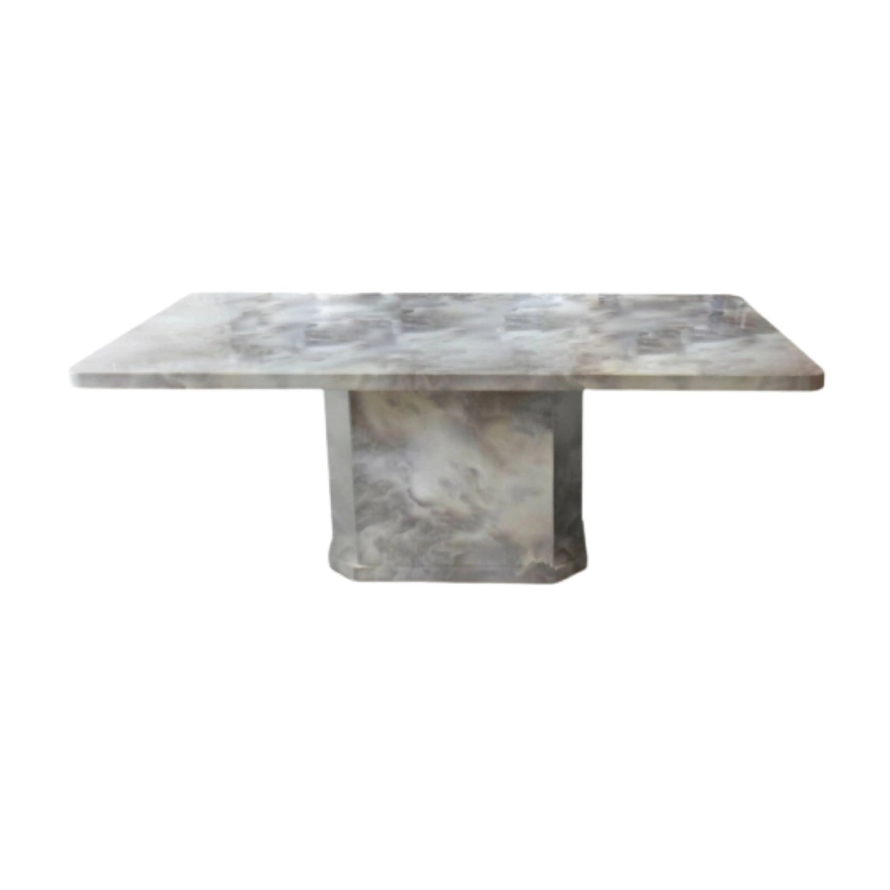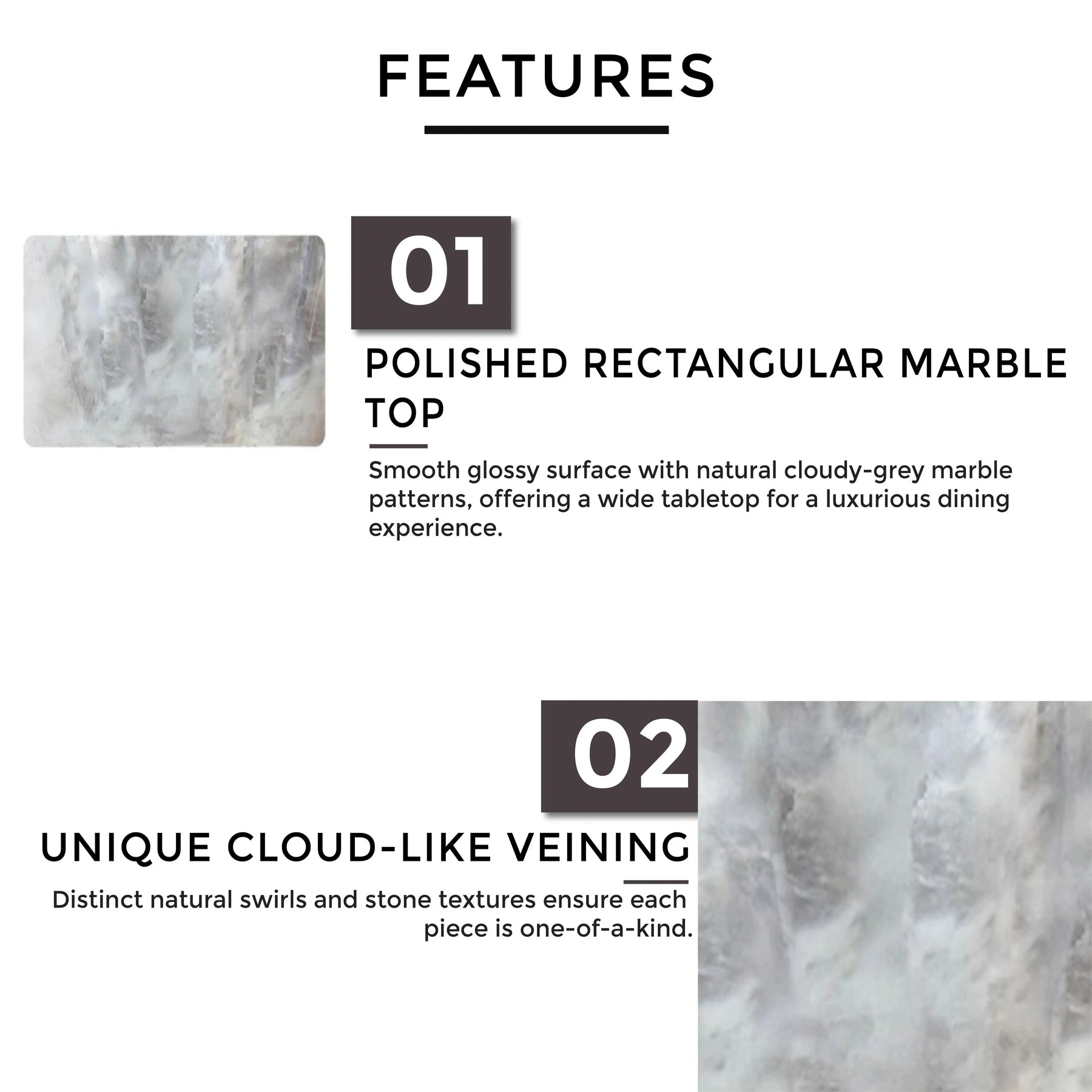 - The REVA Marble Dining Table is a luxurious dining table featuring a polished cloudy-grey marble top with unique natural veining
