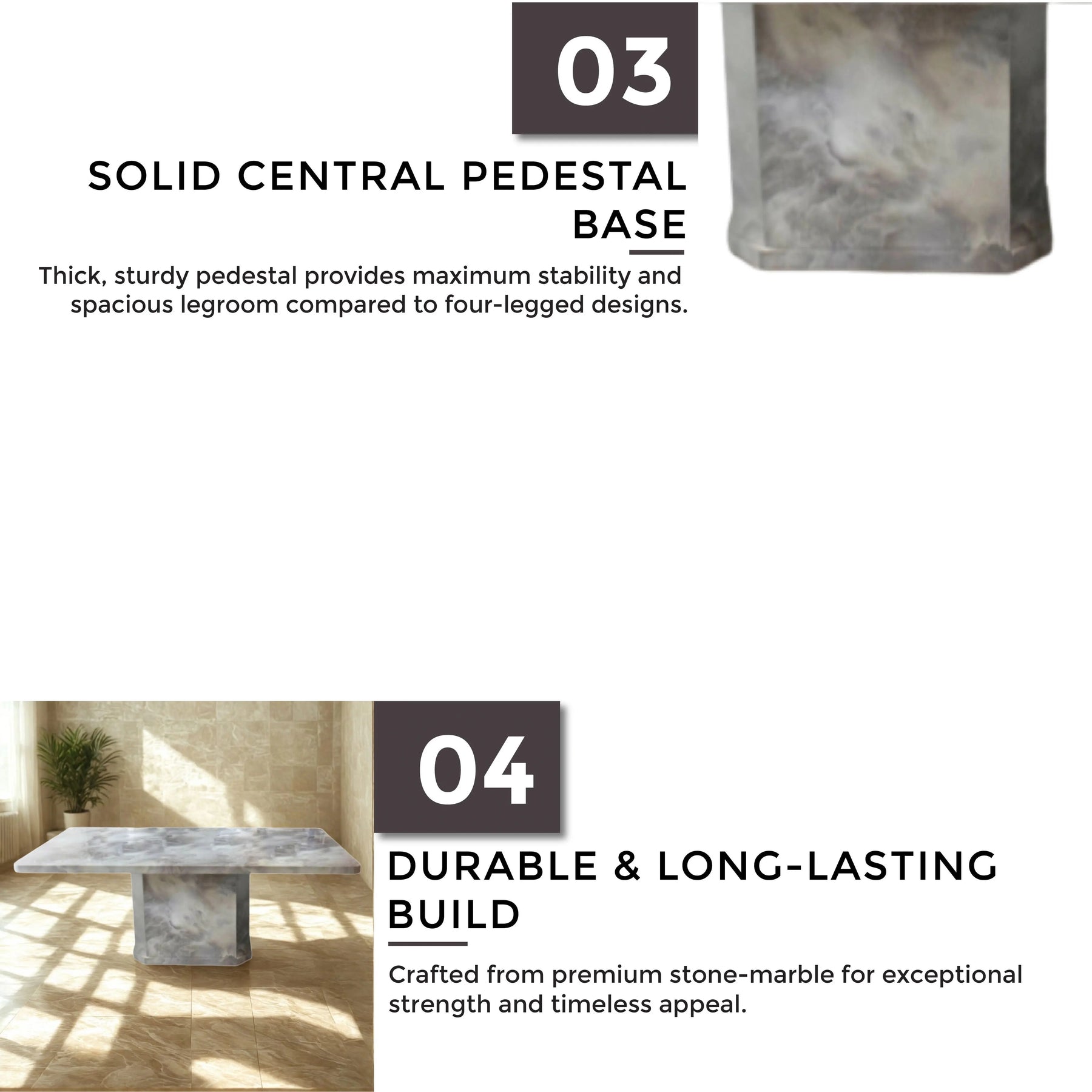 Built with premium marble, the REVA Dining Table guarantees strength and durability. The solid pedestal base not only provides stability but also allows ample legroom, ensuring comfort for everyday dining and special occasions alike.