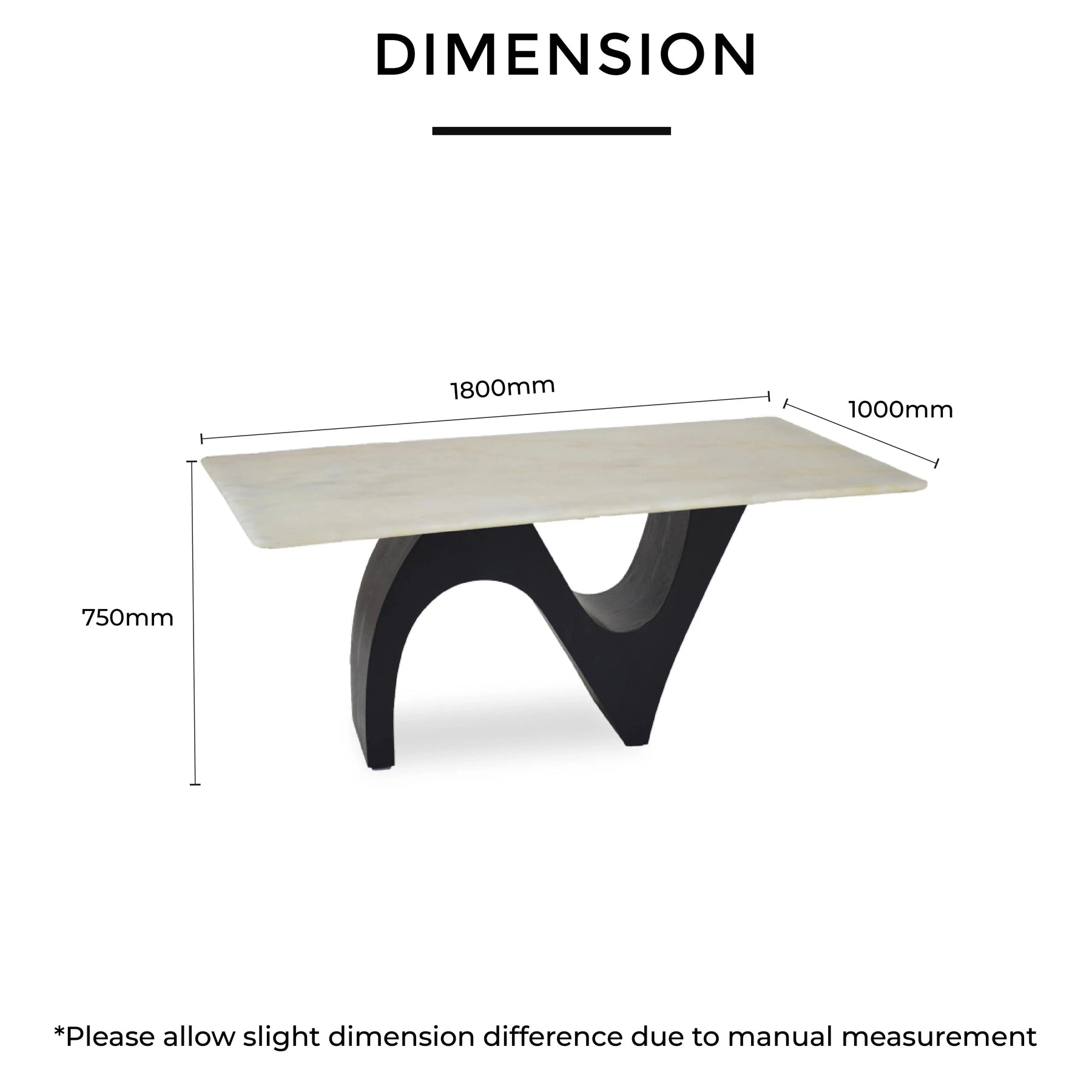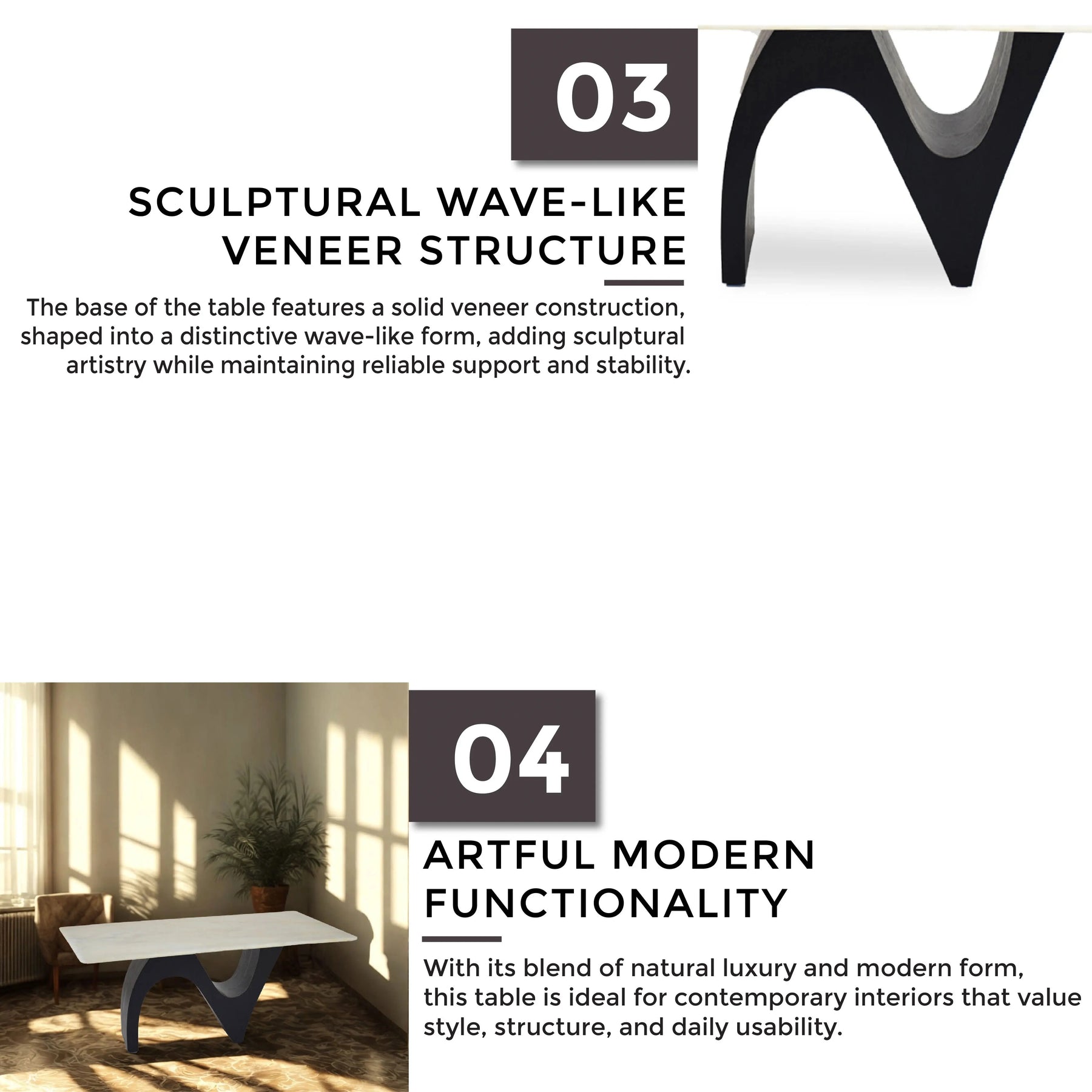 The FLOWER Marble Dining Table stands out with its genuine jade stone top in a polished light finish, paired with a sculptural wave-shaped black veneer base. This striking combination blends luxury with artistic flair, making it a captivating centerpiece for any dining space.