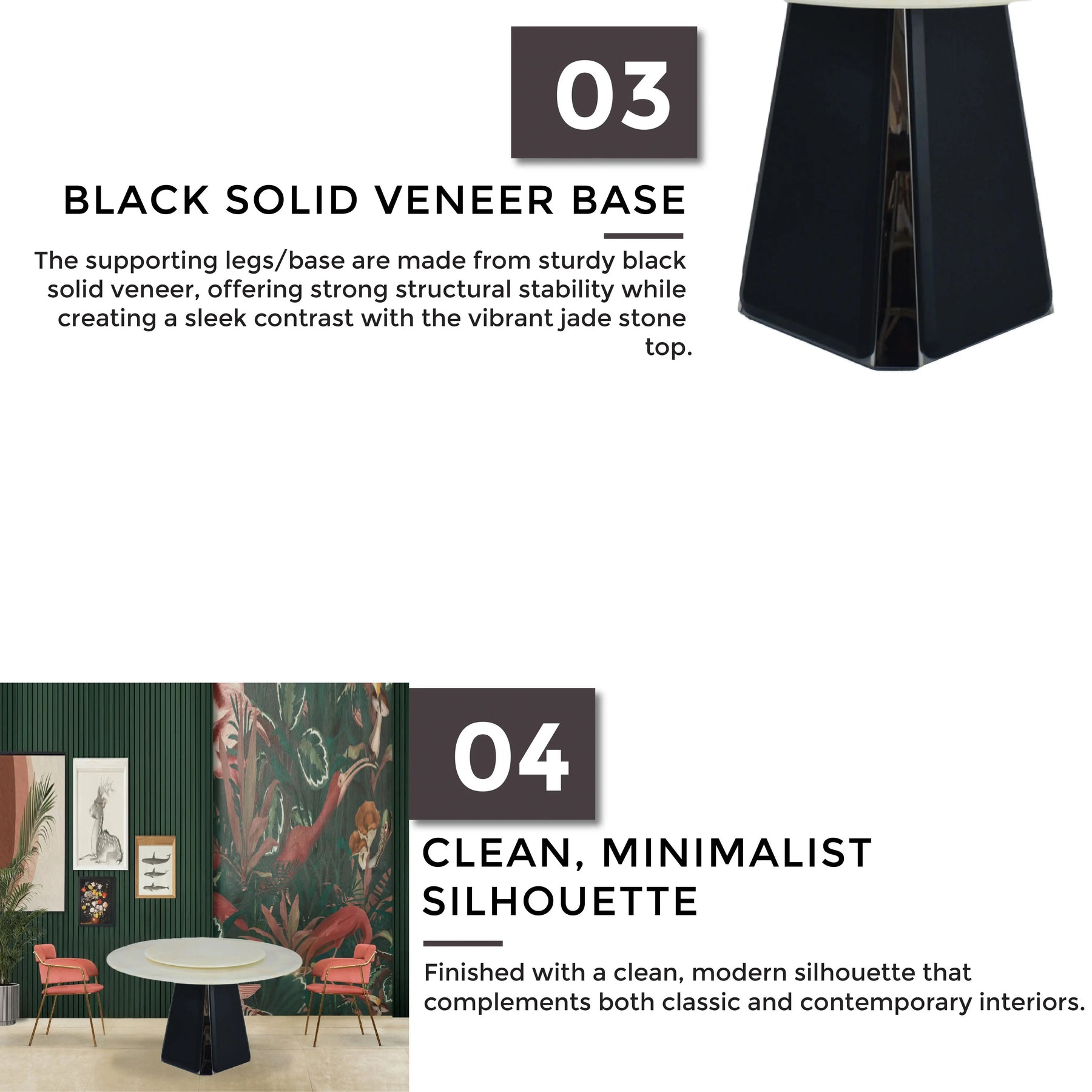 Crafted from natural jade stone and supported by a robust black veneer base, the VALEA Marble Dining Table is built for longevity. Its smooth surface resists scratches and stains, ensuring easy maintenance while maintaining its timeless appeal.