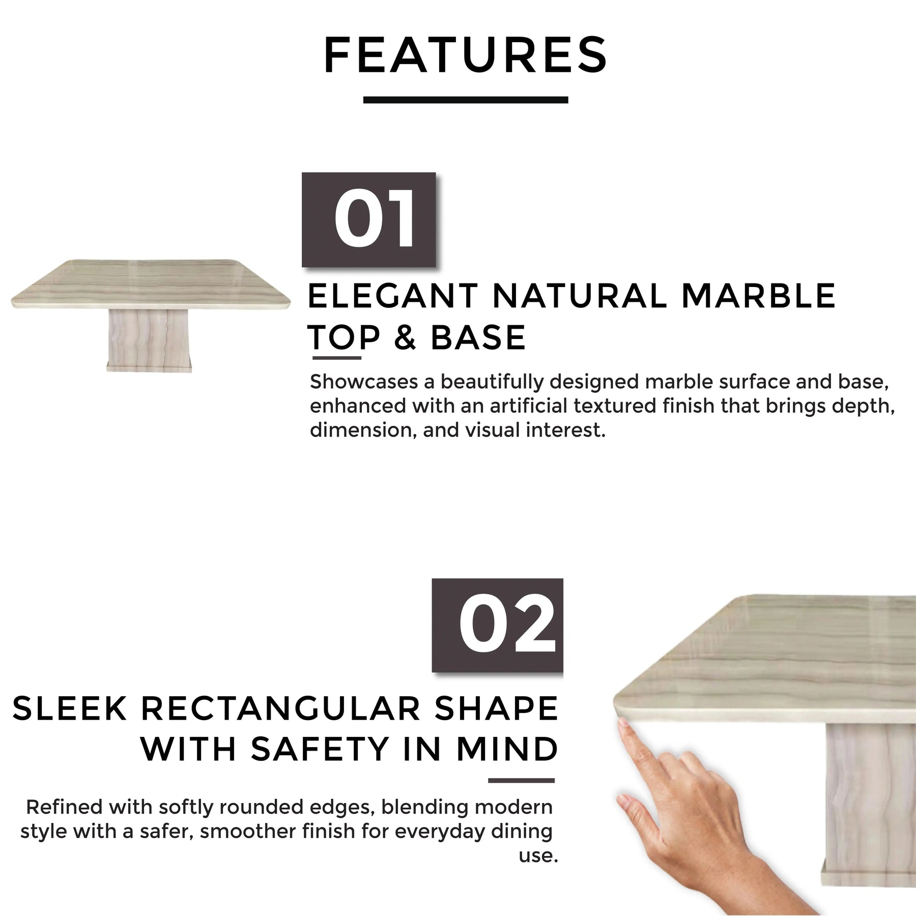 - The BRINEA Marble Dining Table features a natural marble top and base with an artificial textured finish for added depth and artistry