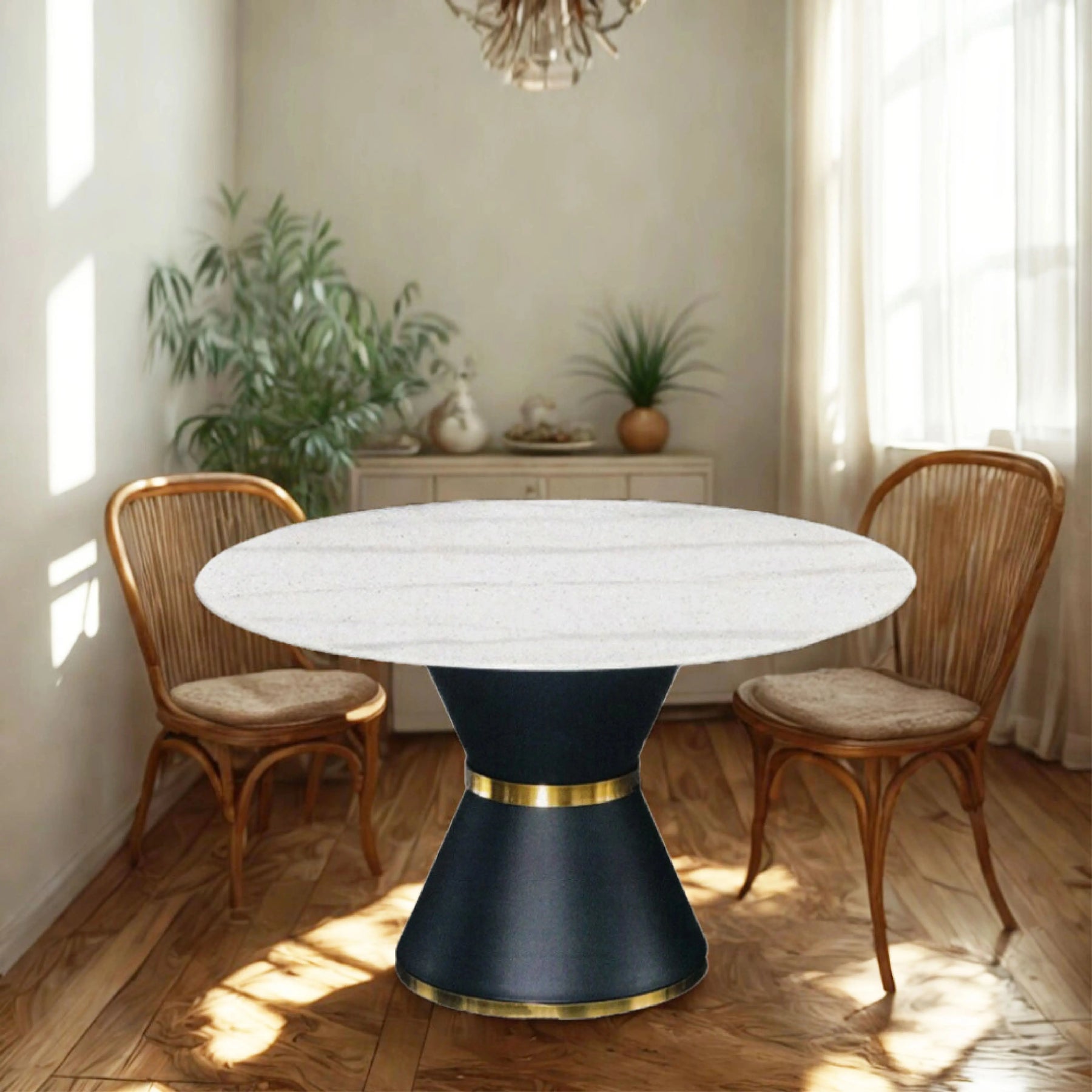 KAELLA Marble Dining Table with white sintered stone top, black hourglass metal base, and gold trim - modern luxury dining furniture - Td Furniture