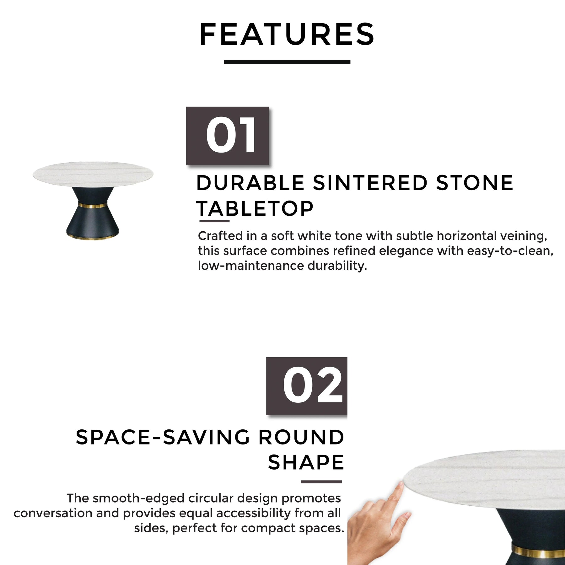 - The KAELLA Marble Dining Table features a durable sintered stone top in soft white with subtle veining, blending modern elegance with practicality