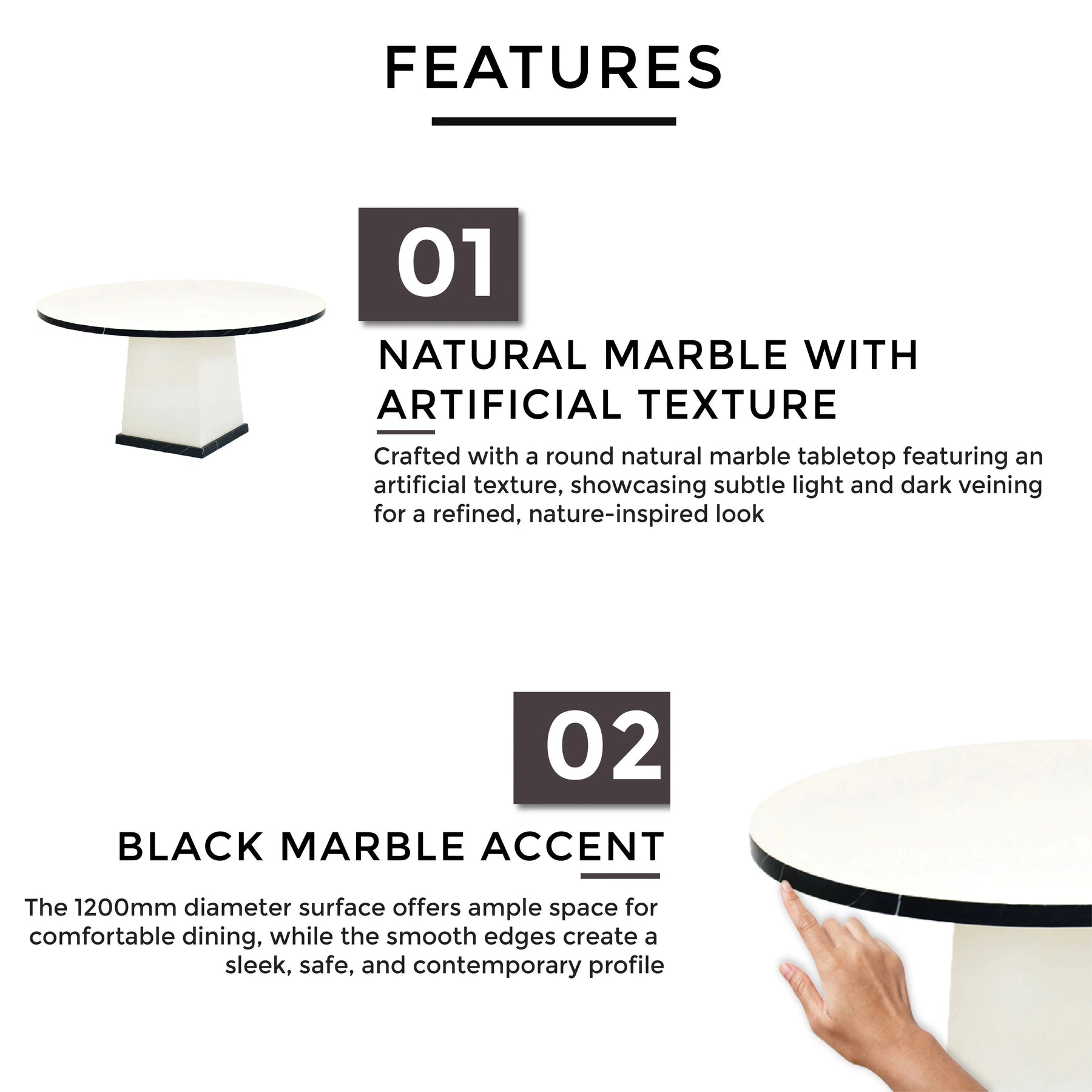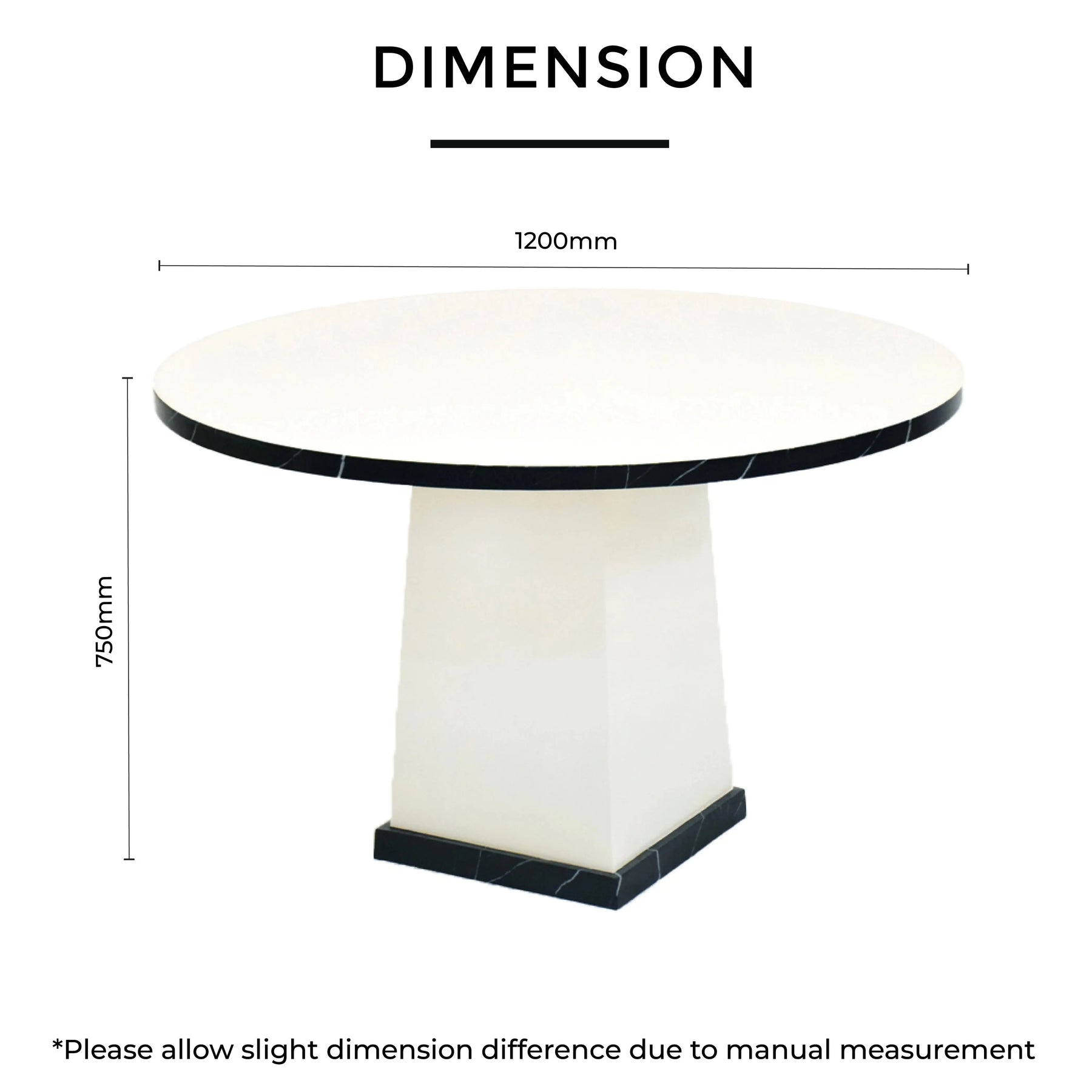 Dimensions SYLVIA Marble Dining Table 1200mm round marble top, 750mm height, geometric pedestal base with black marble accent - Td Furniture