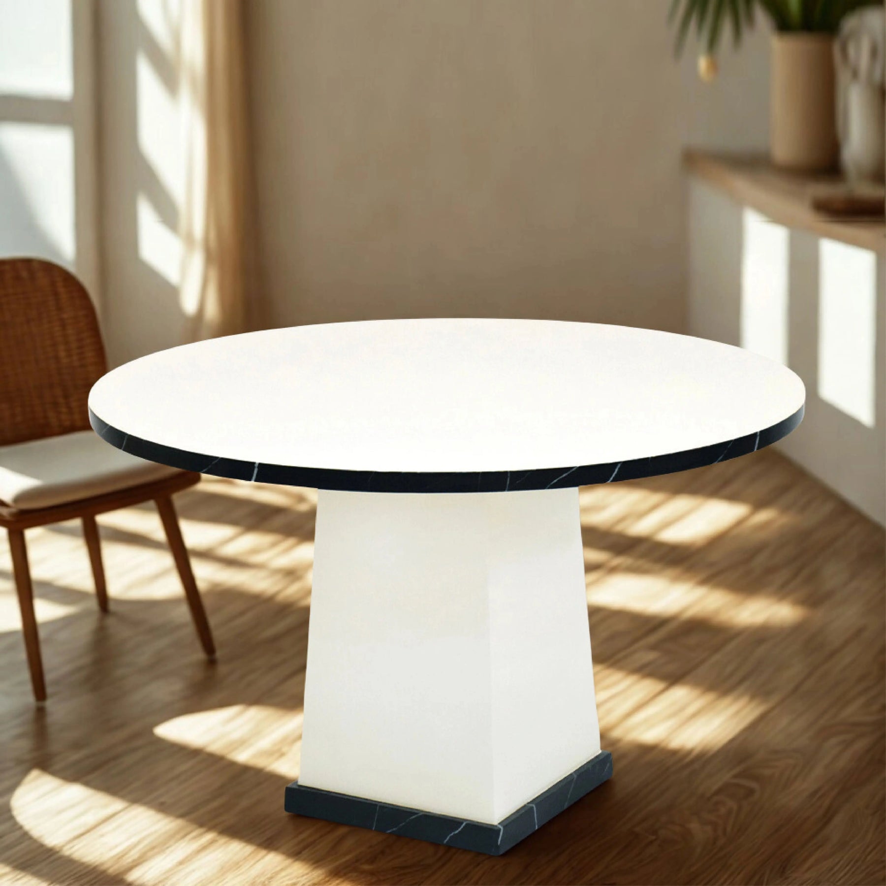 SYLVIA Marble Dining Table with round natural marble top, black marble trim, and geometric pedestal base with black marble accent - Td Furniture