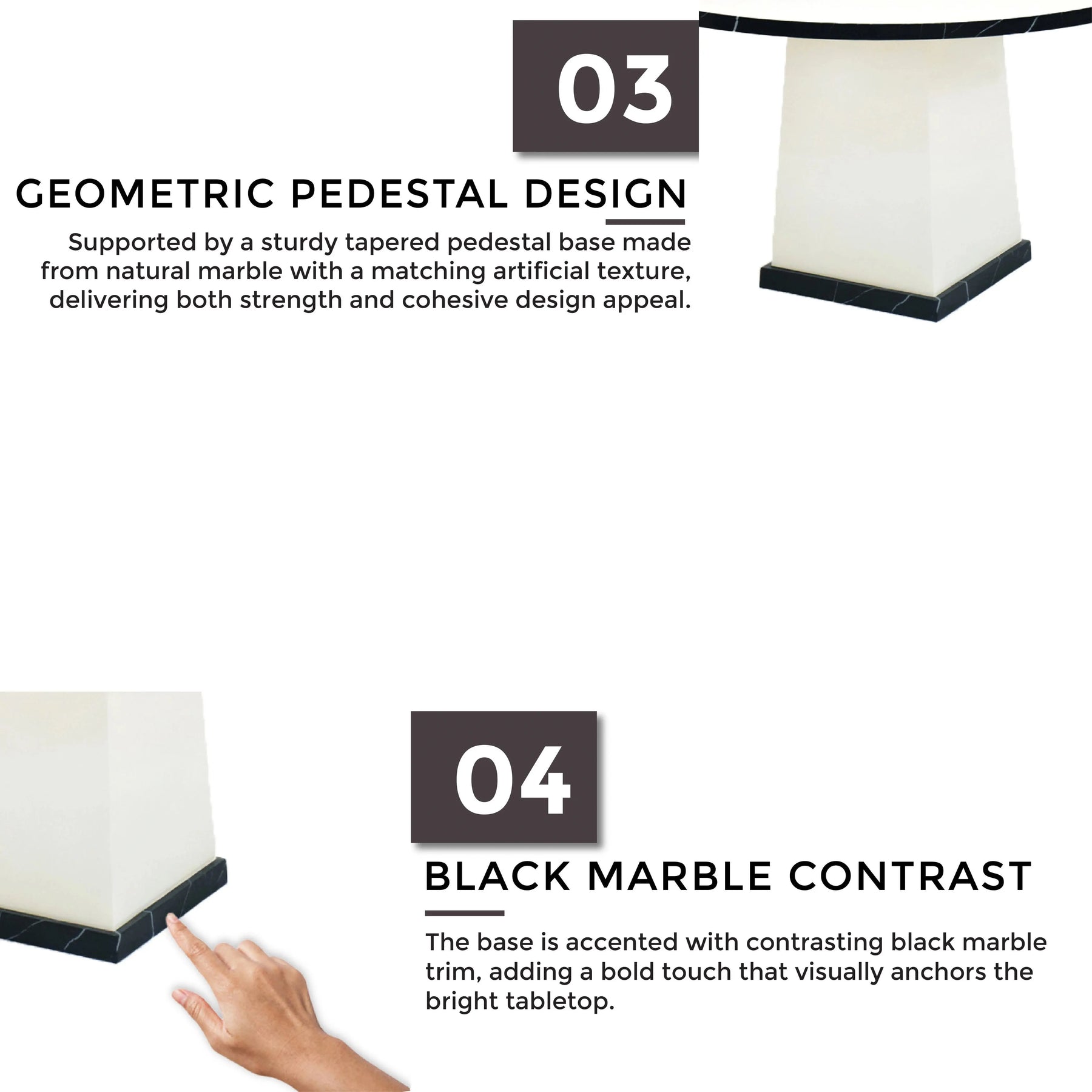 - A bold black marble trim accent along the tabletop and base adds striking contrast and modern appeal