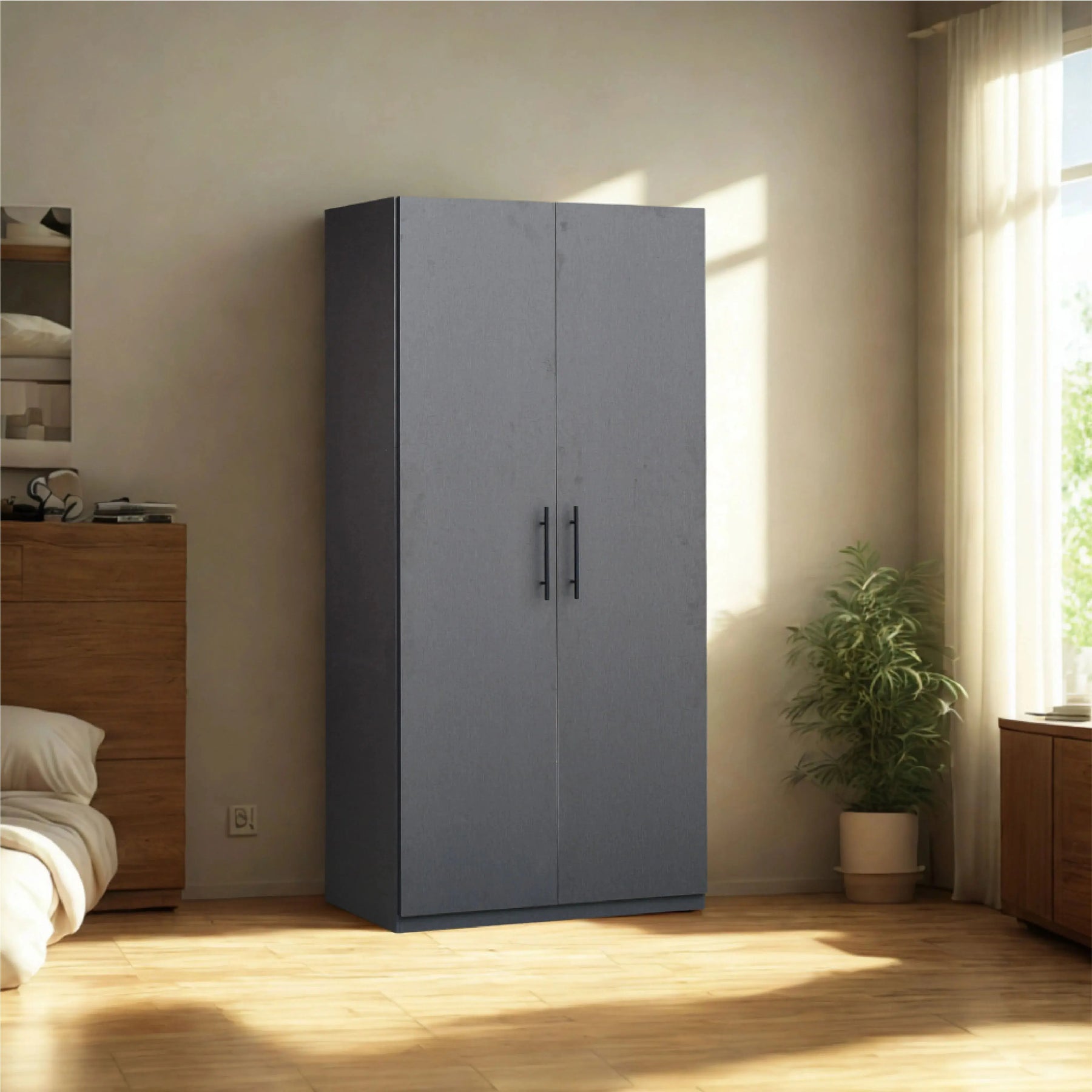Calvin Wardrobe combines modern style, durability and functionality in a compact design perfect for any bedroom. Made from 15mm thick melamine panels, it offers sturdy construction, a soft-close mechanism and versatile storage with hanging rods and shelves. Sleek, easy to maintain and built to last, the CALVIN 2 Swing Door Wardrobe adds both elegance and practicality to your space.