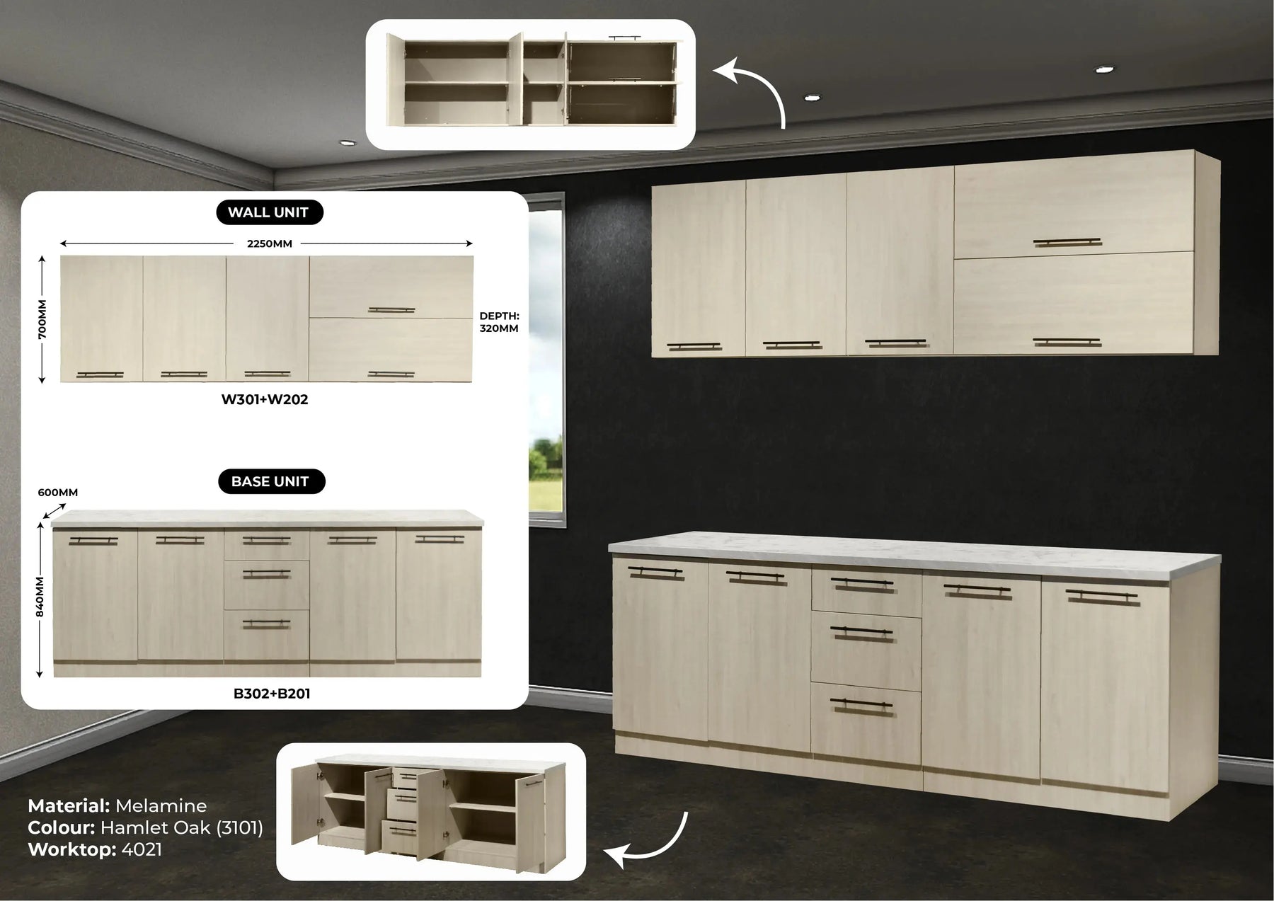 W301+W202+B302+B201 MODULAR 7.5FT KITCHEN CABINET / FULL MELAMINE