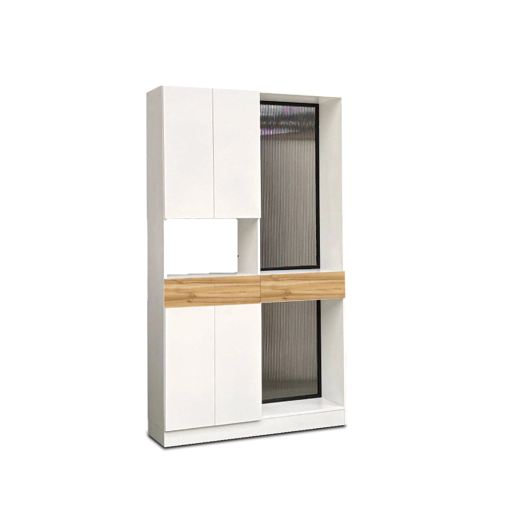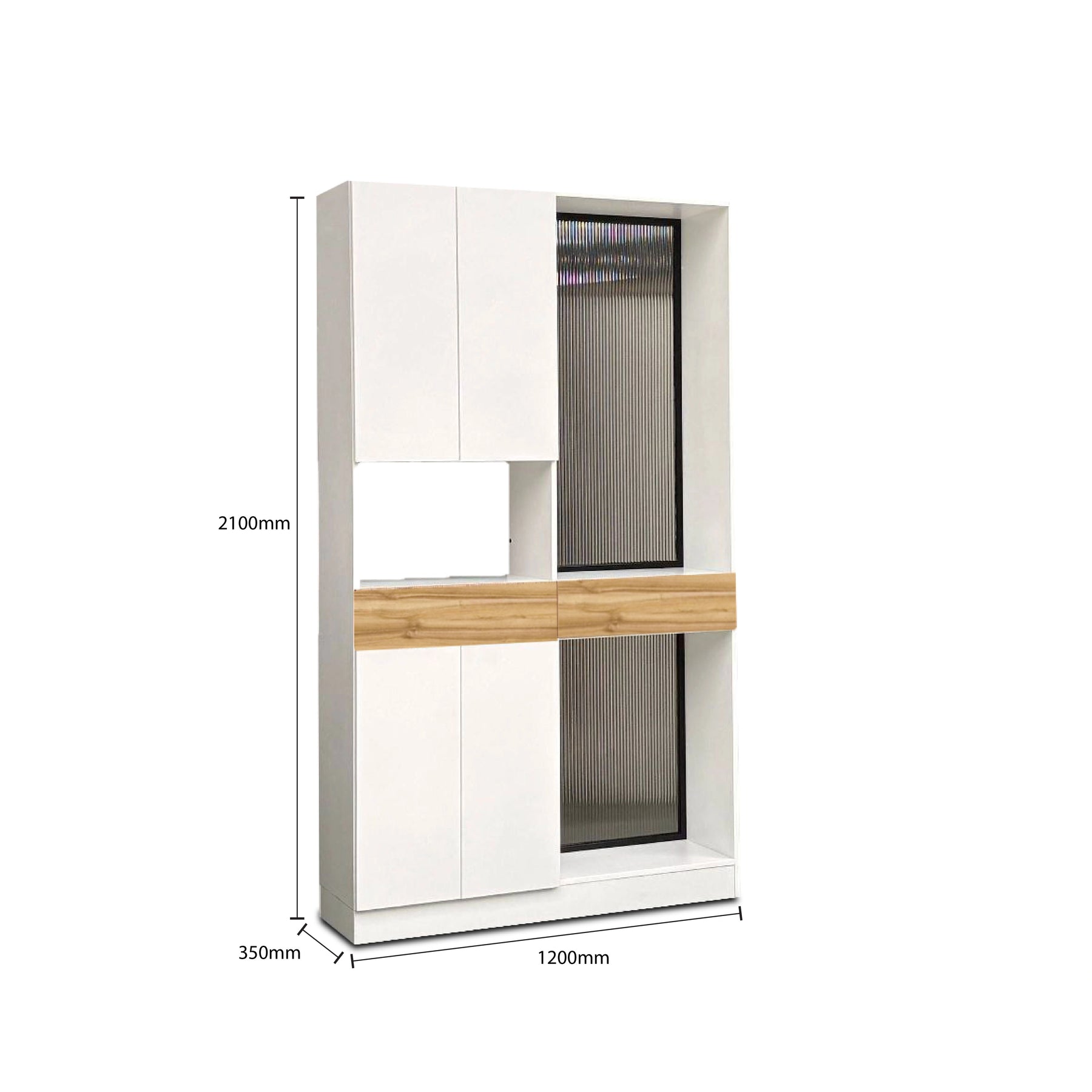 Thoughtfully engineered for maximum utility, the Arvo Divider combines multi-tier display areas with high-capacity concealed storage. It features four large swing-door cabinets equipped with precision hinges and push-to-open magnetic catches for a sleek, handle-free look. Complementing the solid cabinetry is a striking fluted glass panel that adds a layer of privacy while allowing light to filter through, alongside an open central display nook perfect for showcasing your favorite decor.