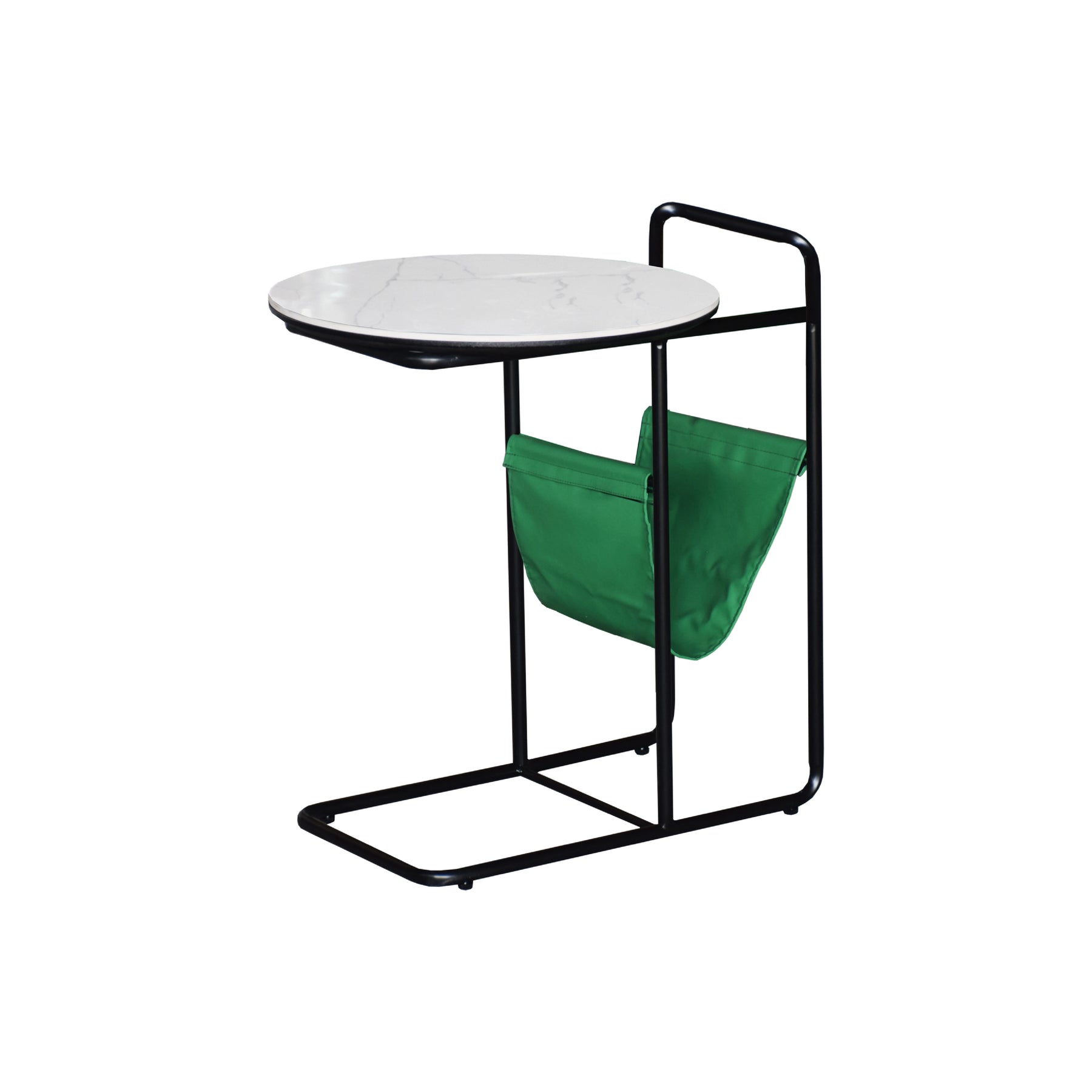 Designed for a streamlined lifestyle, the Centrova is built on an architectural black metal frame that integrates a vibrant green storage sling at its base. This functional fabric pocket is perfect for neatly organizing magazines, books, or tablets while maintaining an open and airy look. With its unique C-shaped silhouette and elevated 610mm height, this table can easily tuck over the arm of a sofa or chair, making it an ideal companion for compact modern lounges and reading nooks.