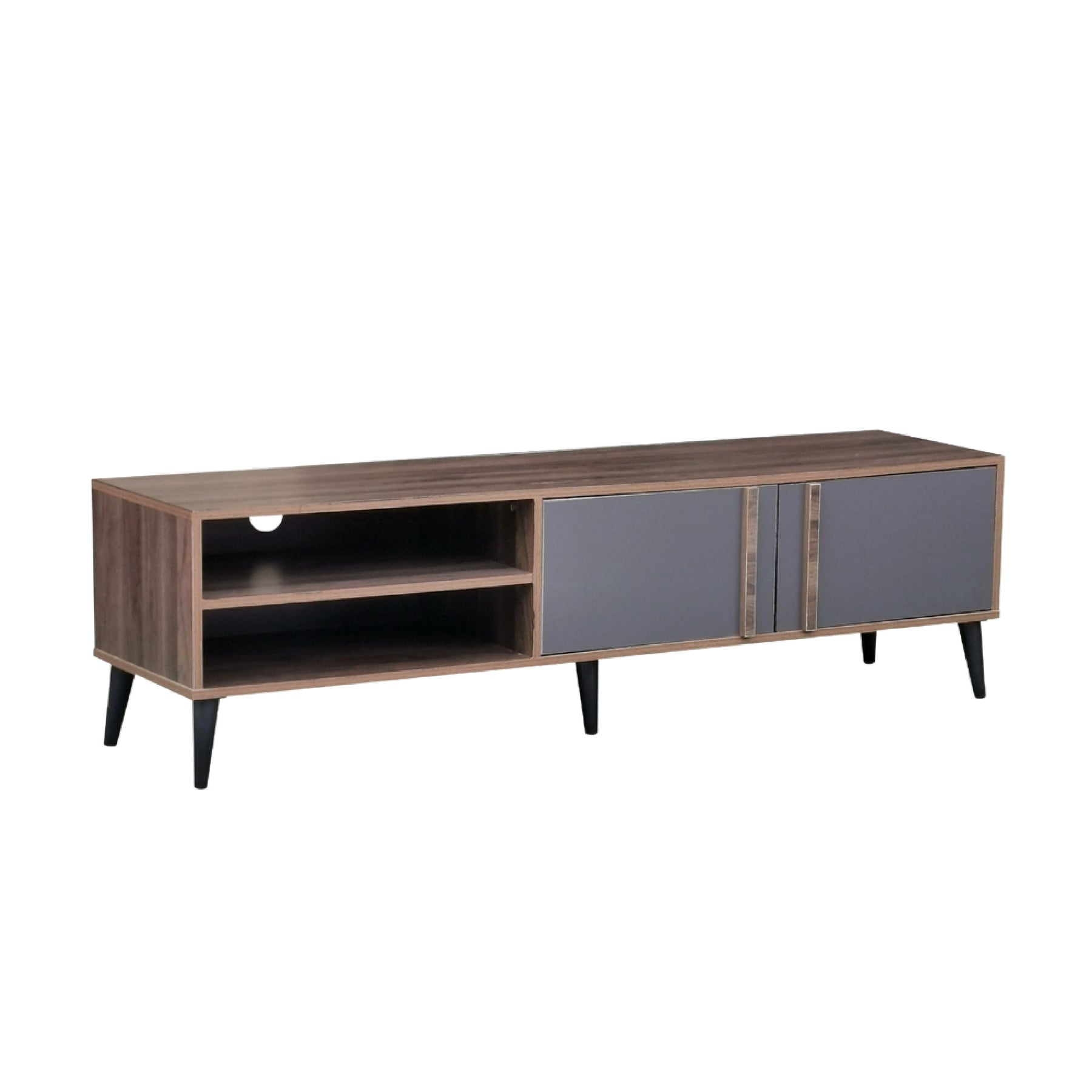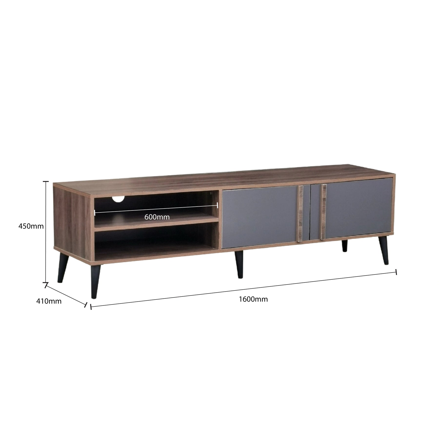 The Coventry TV Cabinet is a sophisticated entertainment unit that features a distinctive two-tone aesthetic, blending a modern Grey frame with warm Walnut accents. At 1600mm wide, this mid-sized console is designed to fit comfortably in standard living rooms while providing a sturdy platform for your television. The unit is constructed from high-quality Amino Laminate, ensuring a surface that is both durable and easy to maintain. Its balanced design offers a mix of open shelving for media devices and concealed storage to keep your entertainment area organized and clutter-free.