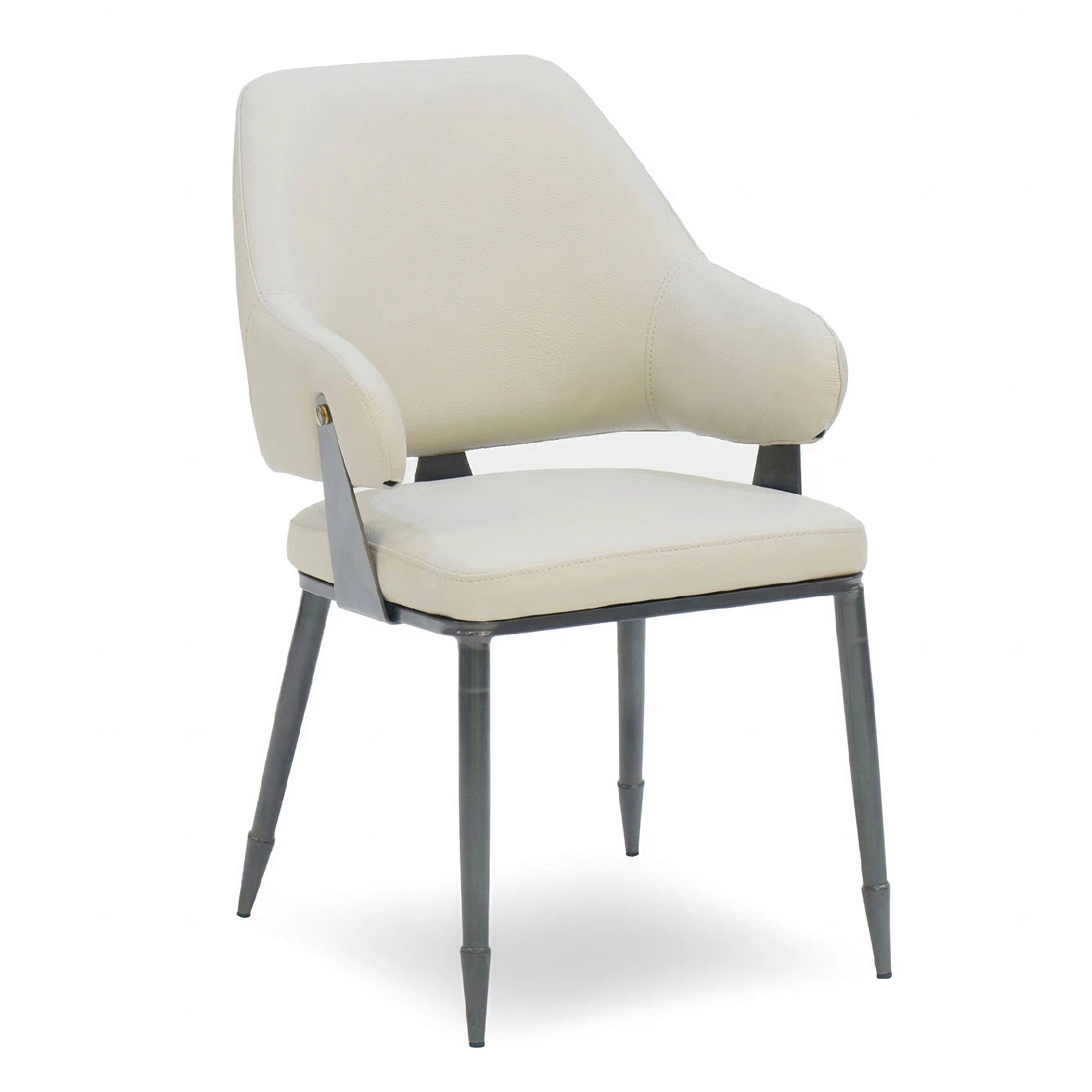 The Deluna Dining Chair is an architectural masterpiece designed for those who value executive comfort and mid-century modern aesthetics. This chair features a unique wraparound bucket-style seat with integrated, low-profile armrests, upholstered in premium Grey PU leather for a soft-touch, professional finish. The distinctive "floating" backrest is secured by visible industrial-style metal brackets, adding a sophisticated, structural element to its contemporary profile.
