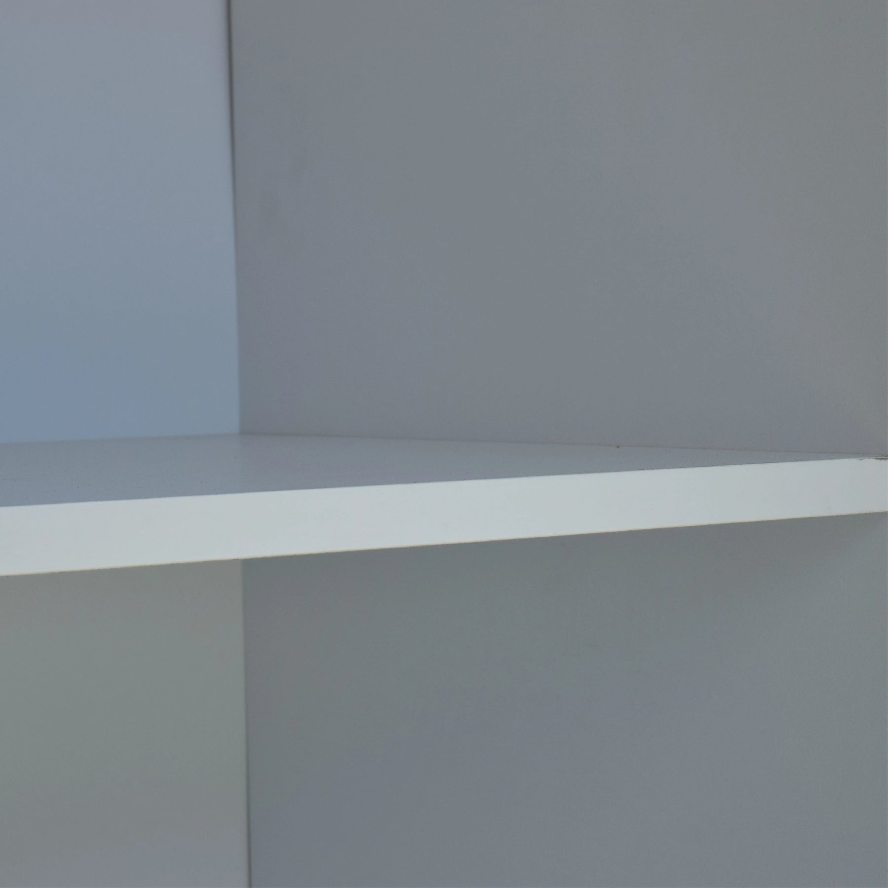 Gray corner cabinet with a white shelf