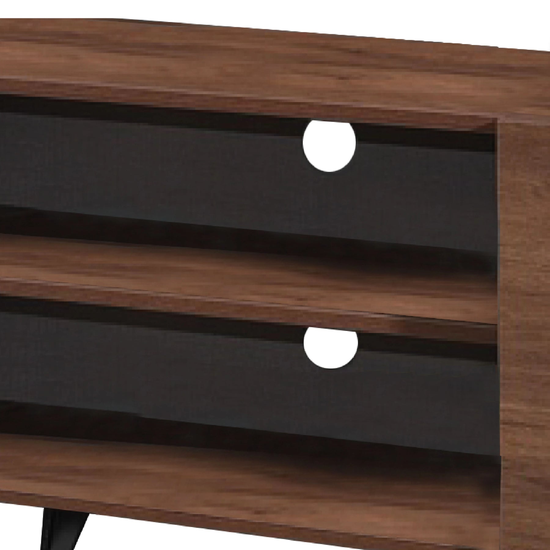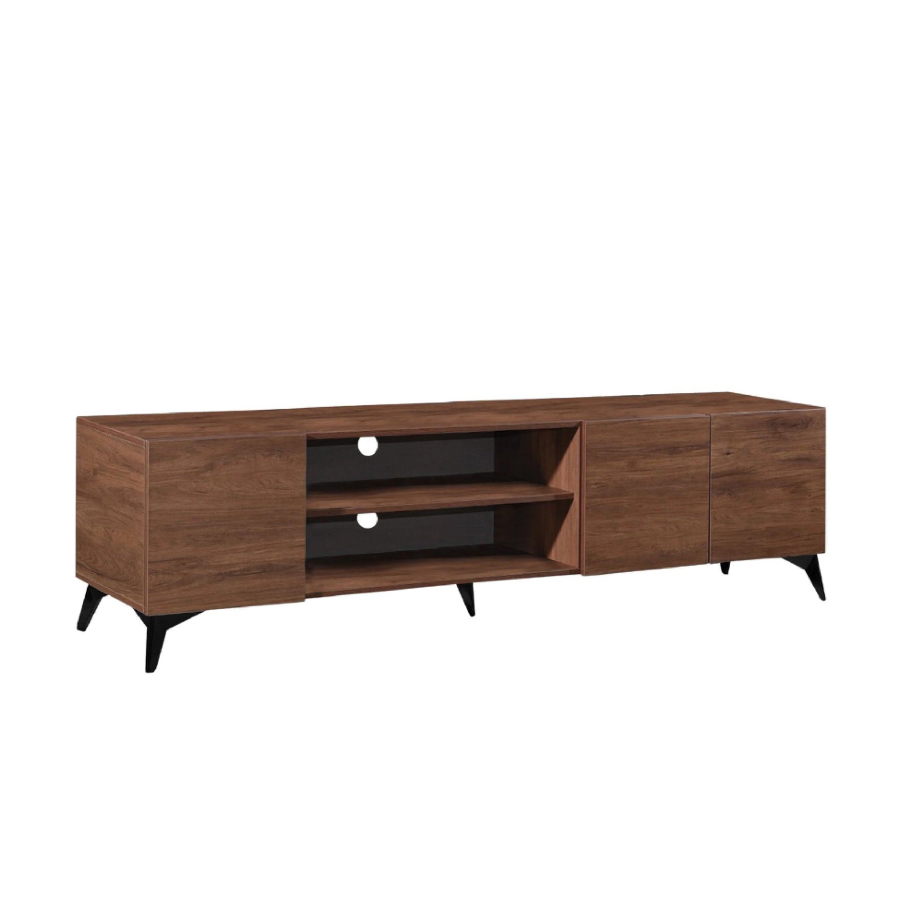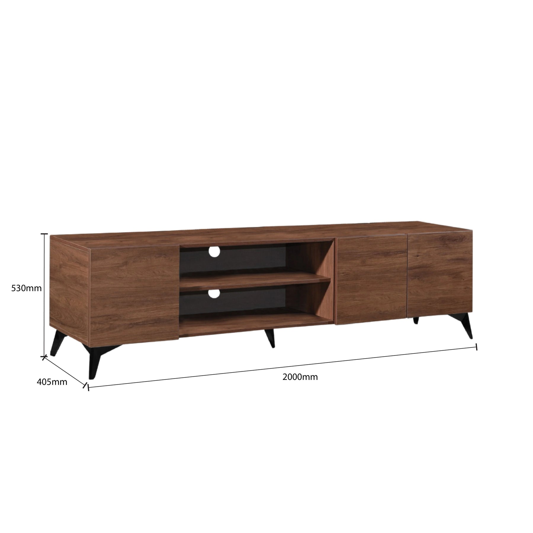 The Esse Urban Oak TV Cabinet brings warm, natural character to a contemporary entertainment wall. At 2,000mm wide, it fills a feature wall confidently — and where most TV consoles at this size feel flat and uniform, the Esse layers three distinct storage zones into a single cohesive piece: two central open shelves for media consoles and set-top boxes (with integrated cable management holes to route wires cleanly out of sight), handle-less closed side compartments that keep clutter hidden behind sleek push-to-open doors, and the whole unit lifted on tapered black designer legs that add an industrial edge and visual lightness. The legs prevent the unit from sitting heavy on the floor — a design detail that makes a 2,000mm piece feel considered rather than massive.