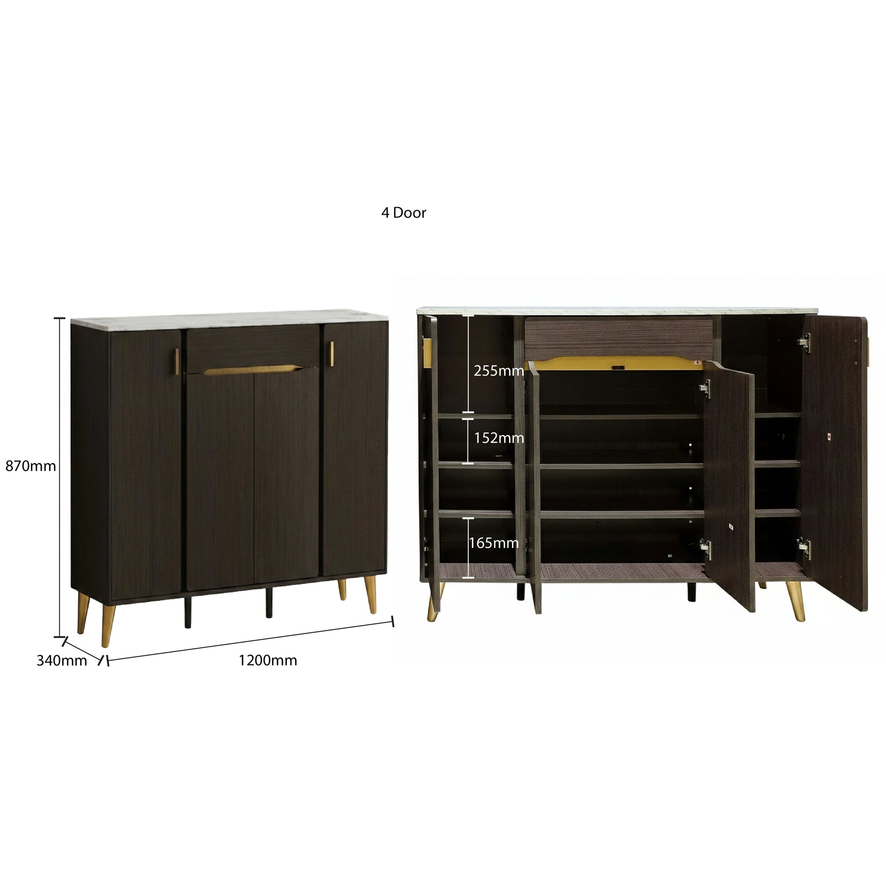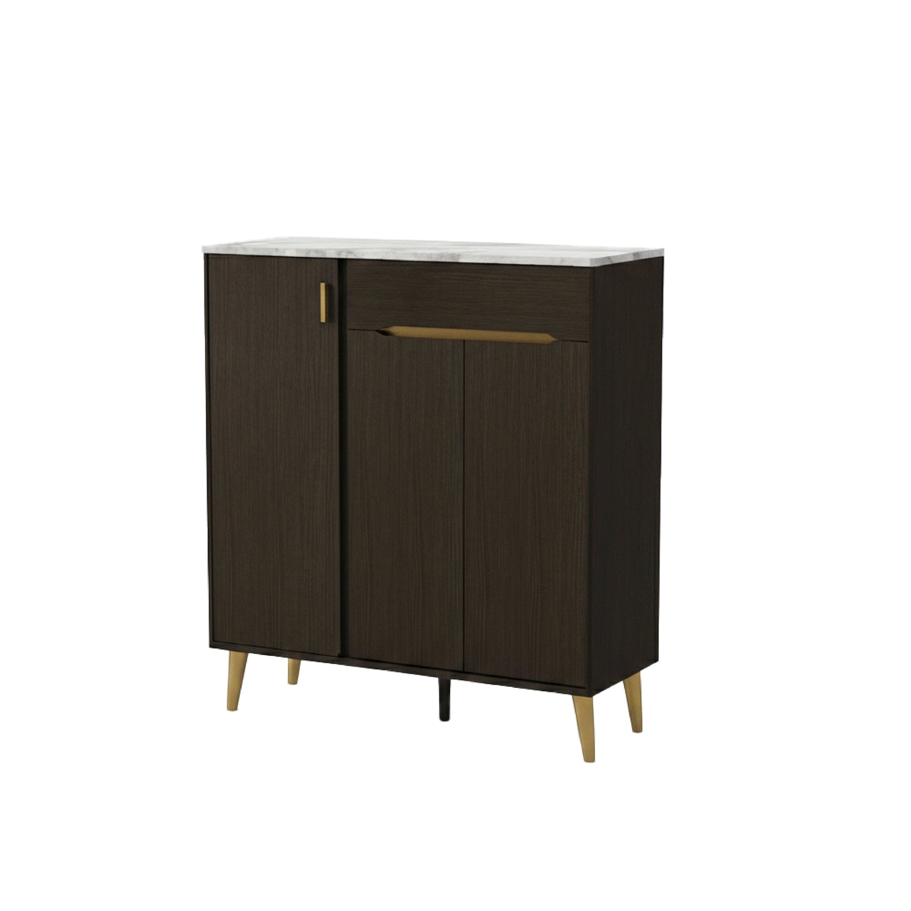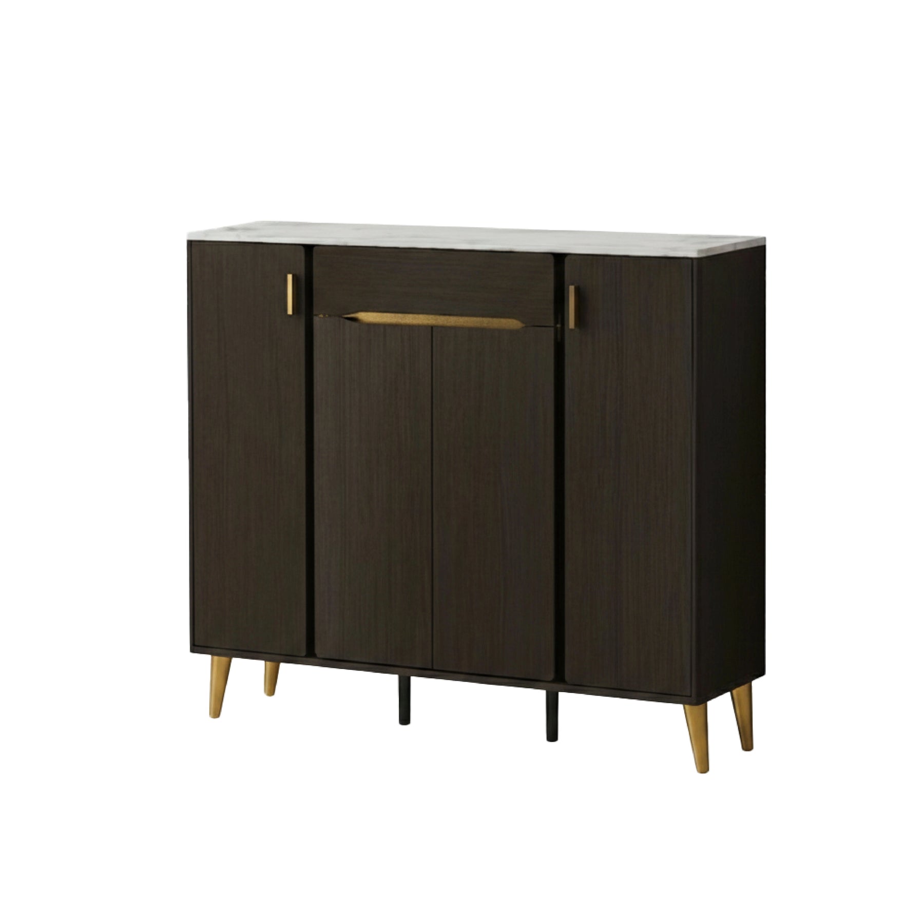 Engineered for both style and durability, the unit is topped with a high-quality Hot Press Top, providing a resilient surface for decorative items or everyday essentials. The interior is designed for efficient organization, offering four spacious tiers of shelving to keep your footwear collection neatly arranged. For a premium finishing touch, the cabinet is accented with elegant vertical gold-tone handles and elevated by matching gold-finish legs. These tapered legs not only provide excellent stability but also create sufficient floor clearance for easy cleaning.