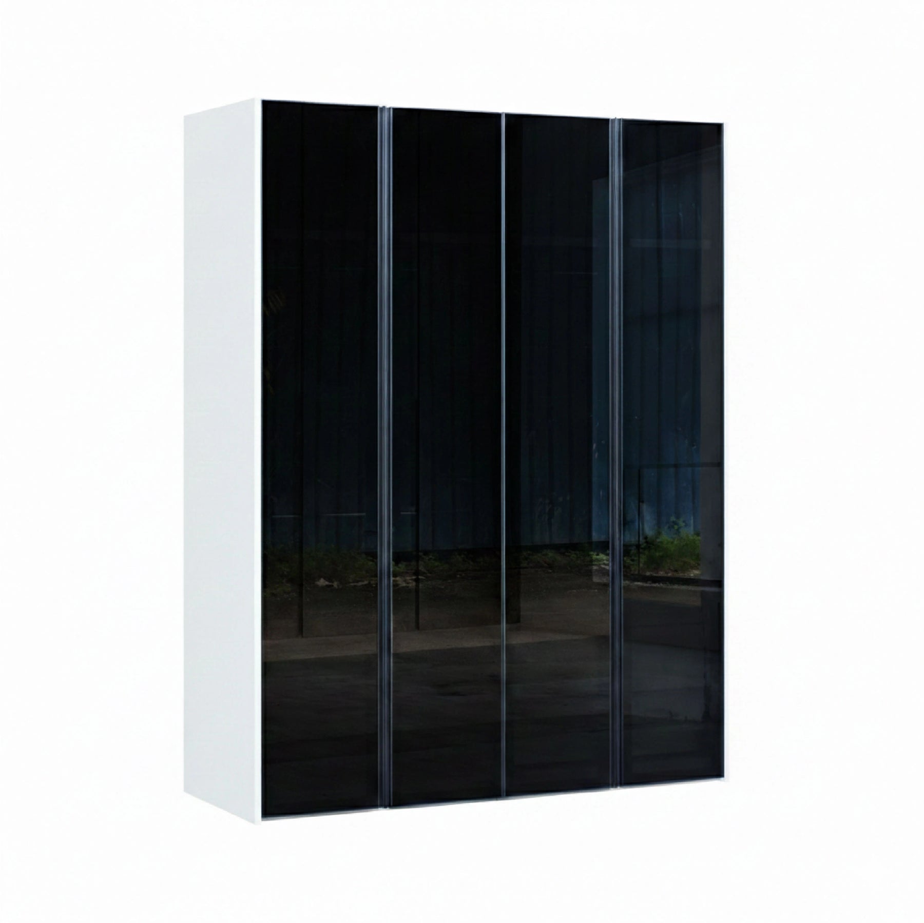 Tall wardrobe with black glass doors and wooden frame on a white background