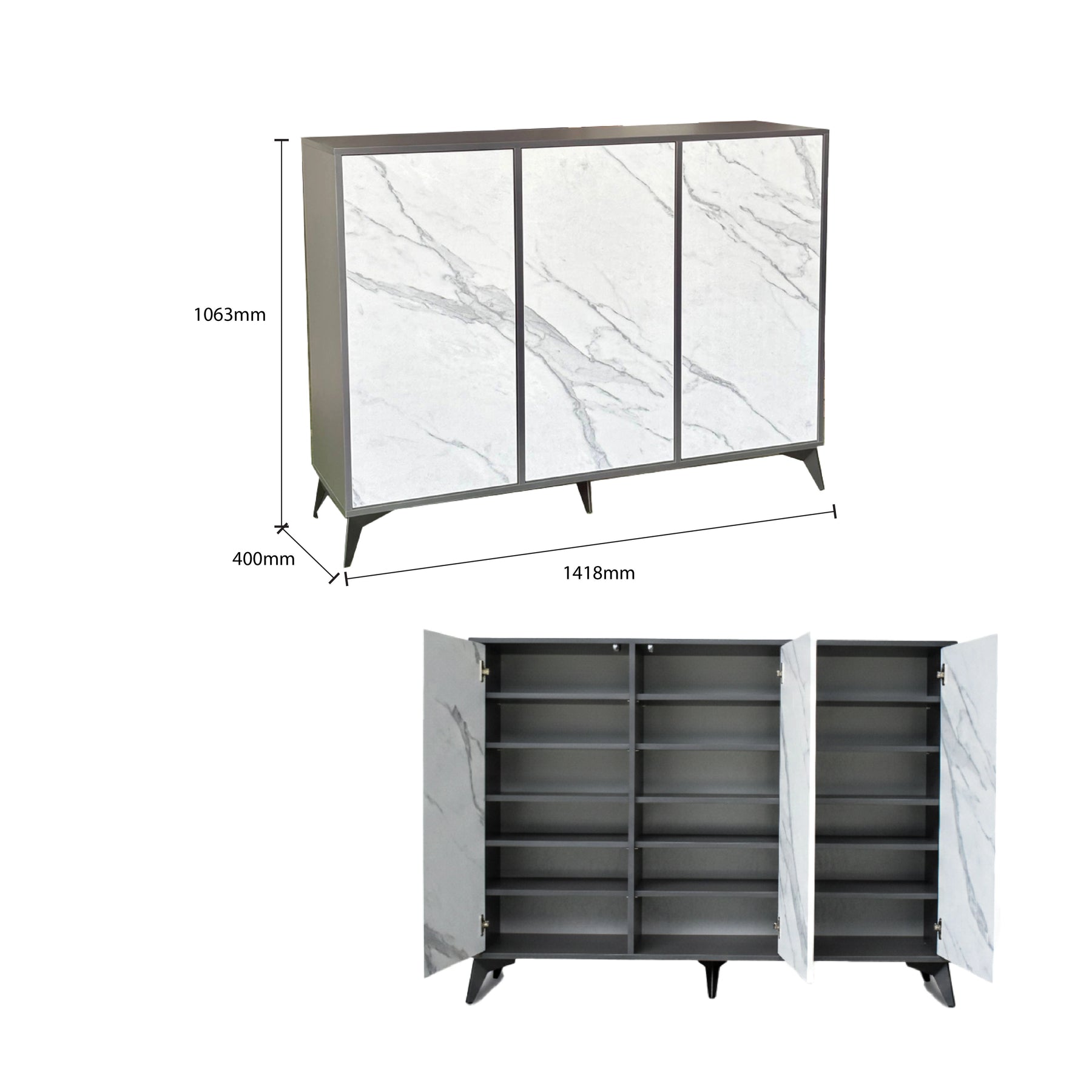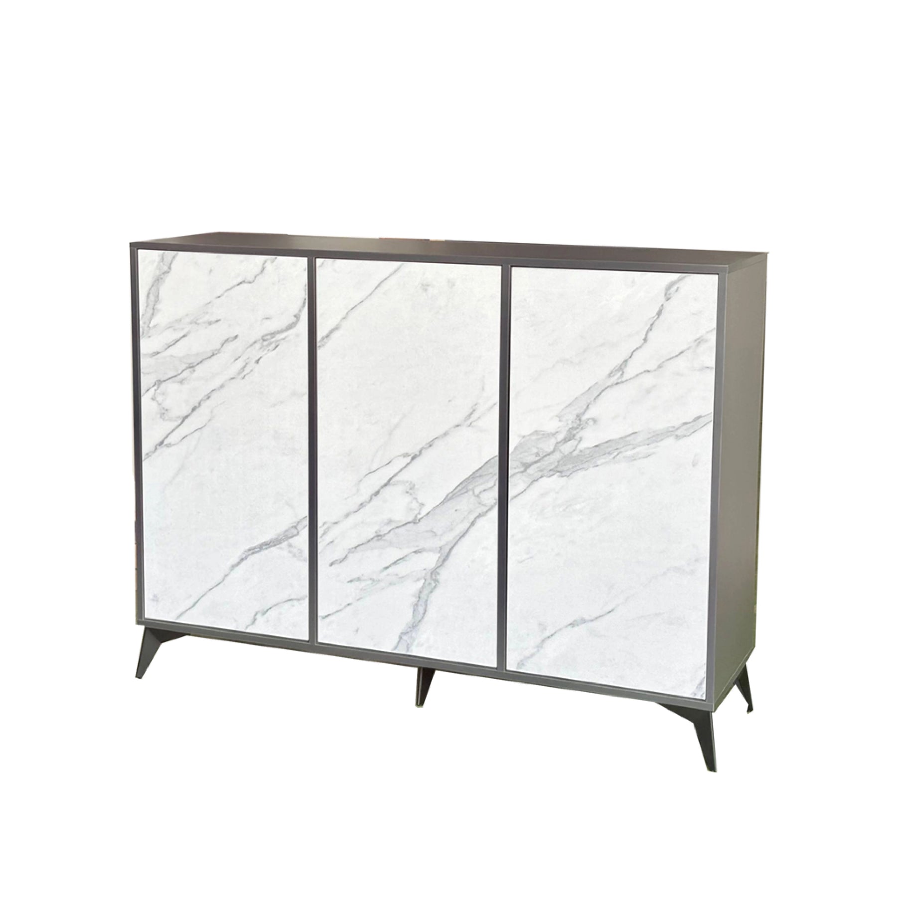 This model features a triple-door design that opens to reveal an exceptionally organized interior divided into three vertical sections. Each section is equipped with six storage levels, providing a total of 18 tiers to accommodate a large footwear collection. The cabinet utilizes a handle-free, push-to-open mechanism for a seamless and sleek exterior look. Constructed from high-quality Melamine, the unit is both durable and easy to maintain. The entire structure is elevated by angular black metal legs, which provide robust stability while creating a contemporary, airy feel.