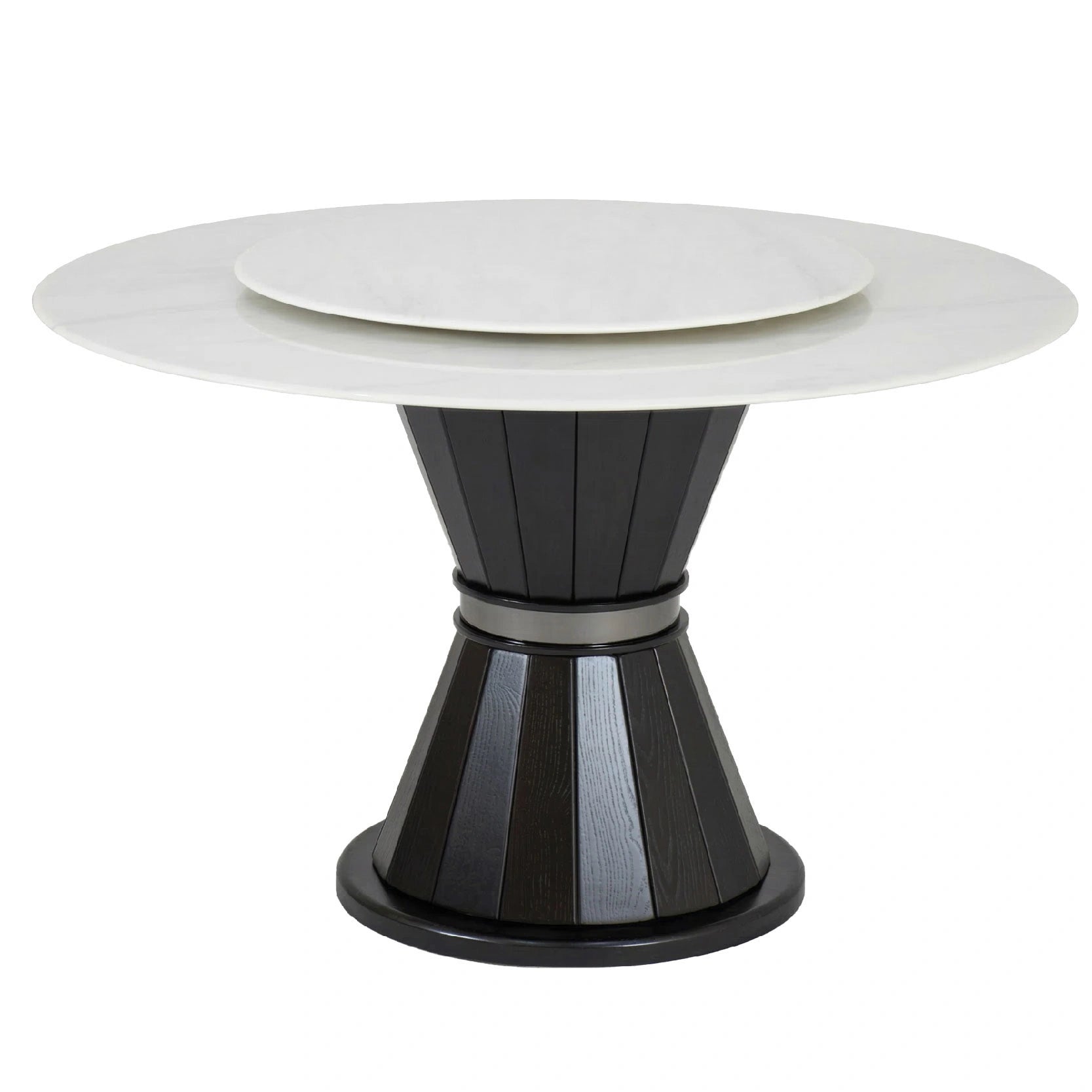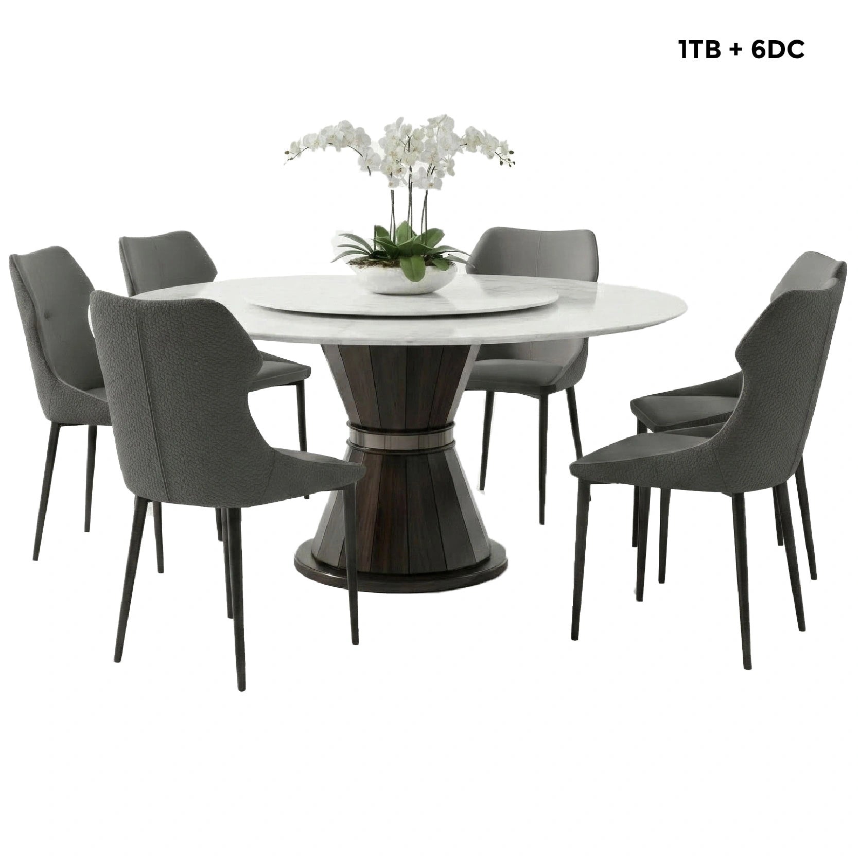 The centerpiece table features an expansive 1300mm Crystal Stone top, showcasing a luminous white surface with ultra-subtle veining. The design is elevated by an integrated 800mm matching stone Lazy Susan, allowing for an effortless and interactive banquet-style dining experience. It stands on a robust dual-conical pedestal base with a multi-faceted vertical ribbed texture in a deep espresso finish, accented by a central metallic ring for a refined, high-end profile. Surrounding the table are the Zephyr Dining Chairs, featuring ergonomic wing-back silhouettes and a duo-texture grey fabric that provides a modern, professional contrast.