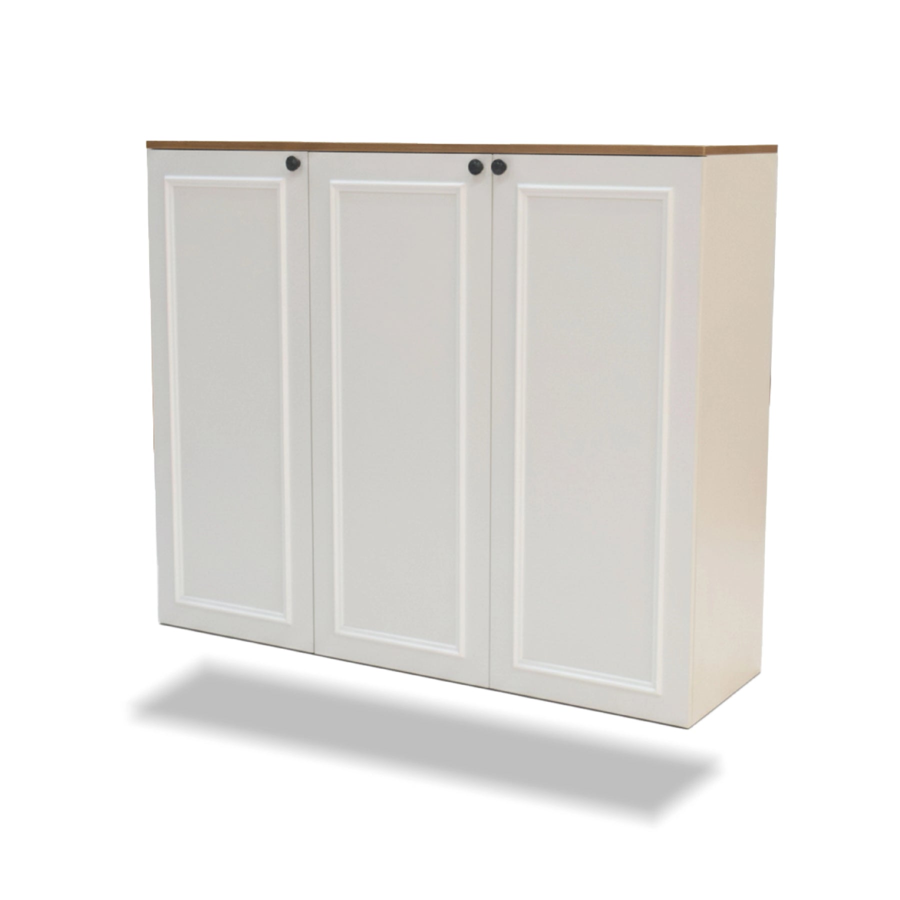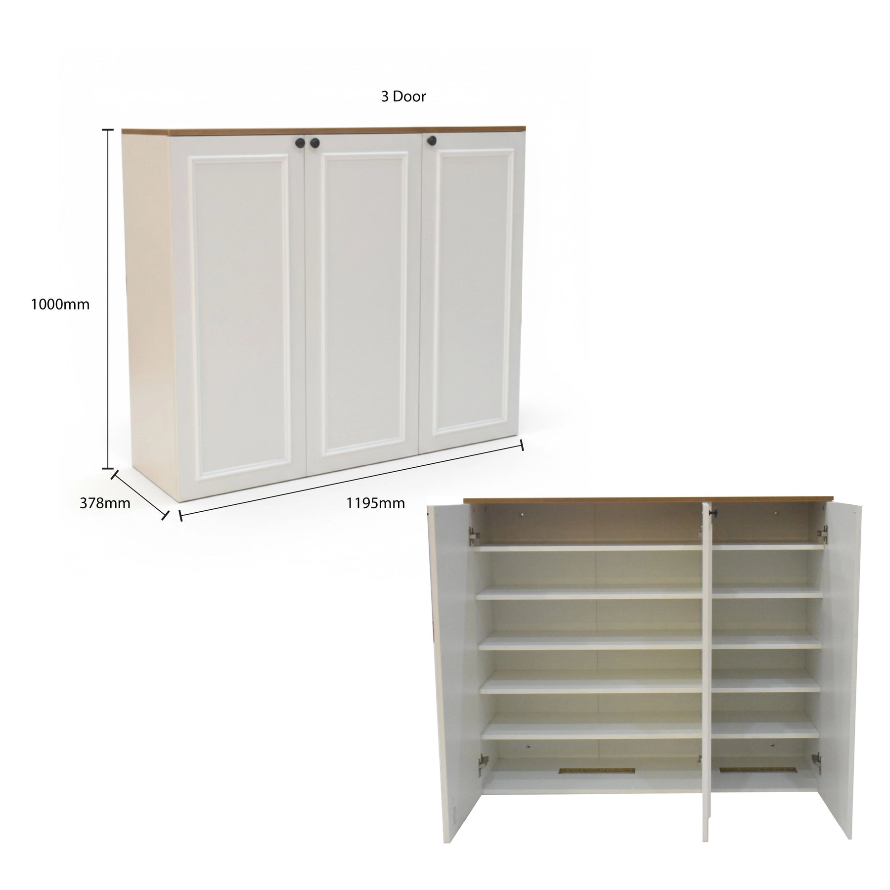 The Kora Shoe Cabinet offers a sophisticated and timeless storage solution for any modern or classic entryway. Its elegant all-white exterior is accented with a warm, wood-grain top surface, creating a beautiful contrast that enhances your home decor. The cabinet doors feature a classic framed panel design, adding texture and a touch of traditional charm.