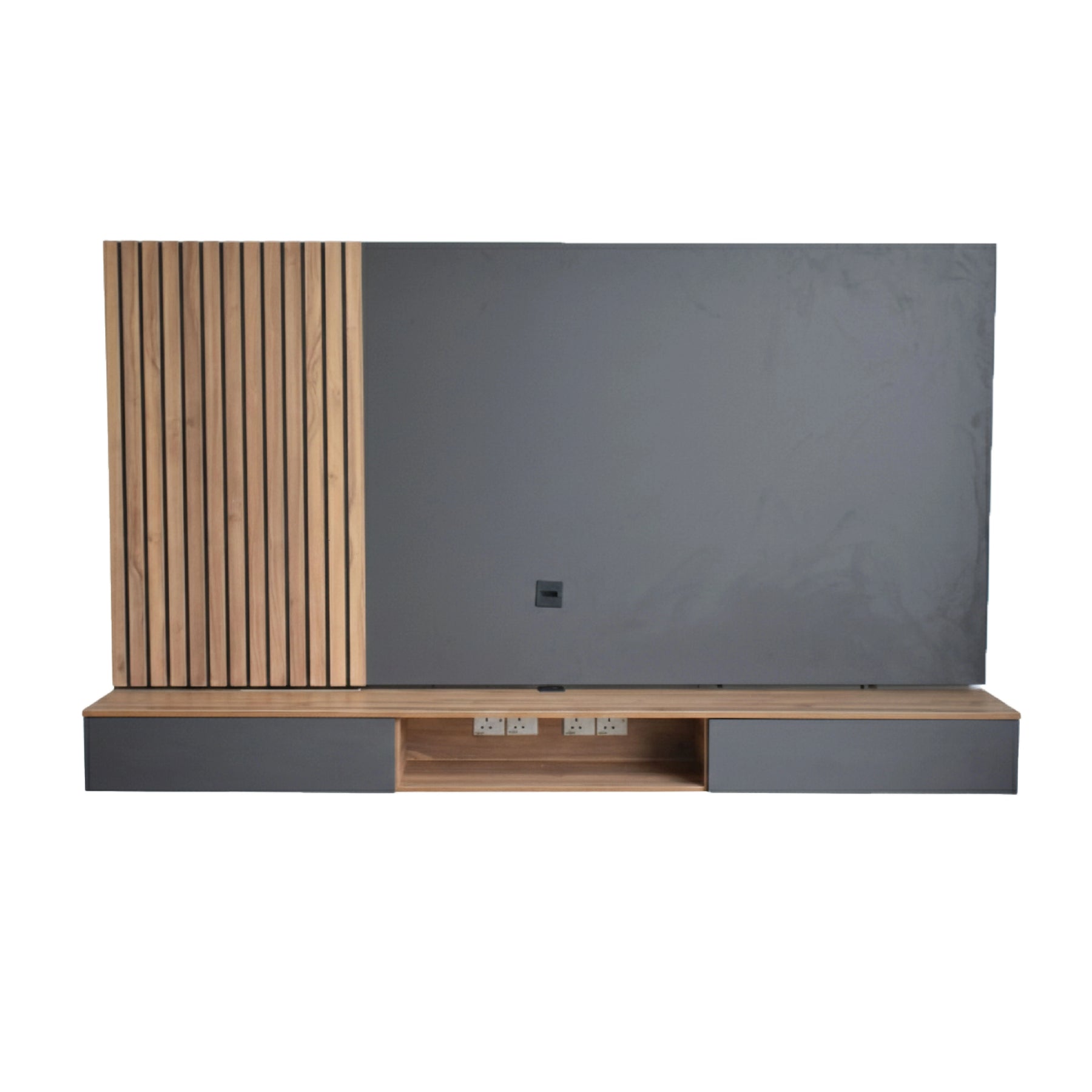 The design features a sophisticated interplay of textures, pairing a dark grey smooth panel with a warm, slatted Soleil Walnut section. Integrated LED lighting behind the slatted panel creates a soft, ambient glow that enhances the room's atmosphere. For ultimate functionality, the unit includes built-in power outlet cutouts and dedicated cable management to keep all wires completely hidden from view. Crafted from high-durability Full Melamine, this cabinet offers two large flip-down storage compartments and a central open shelving area for media consoles.