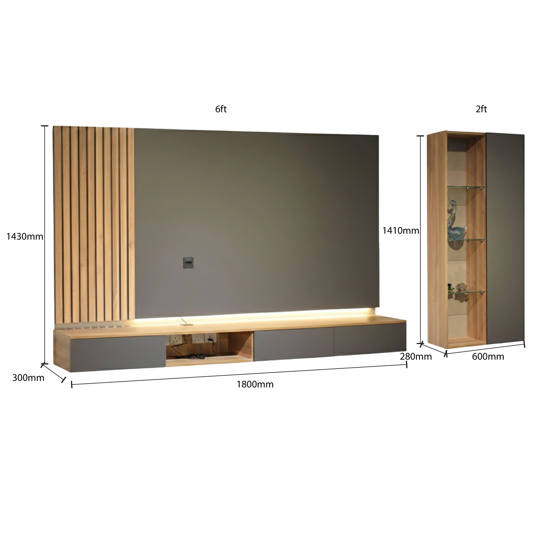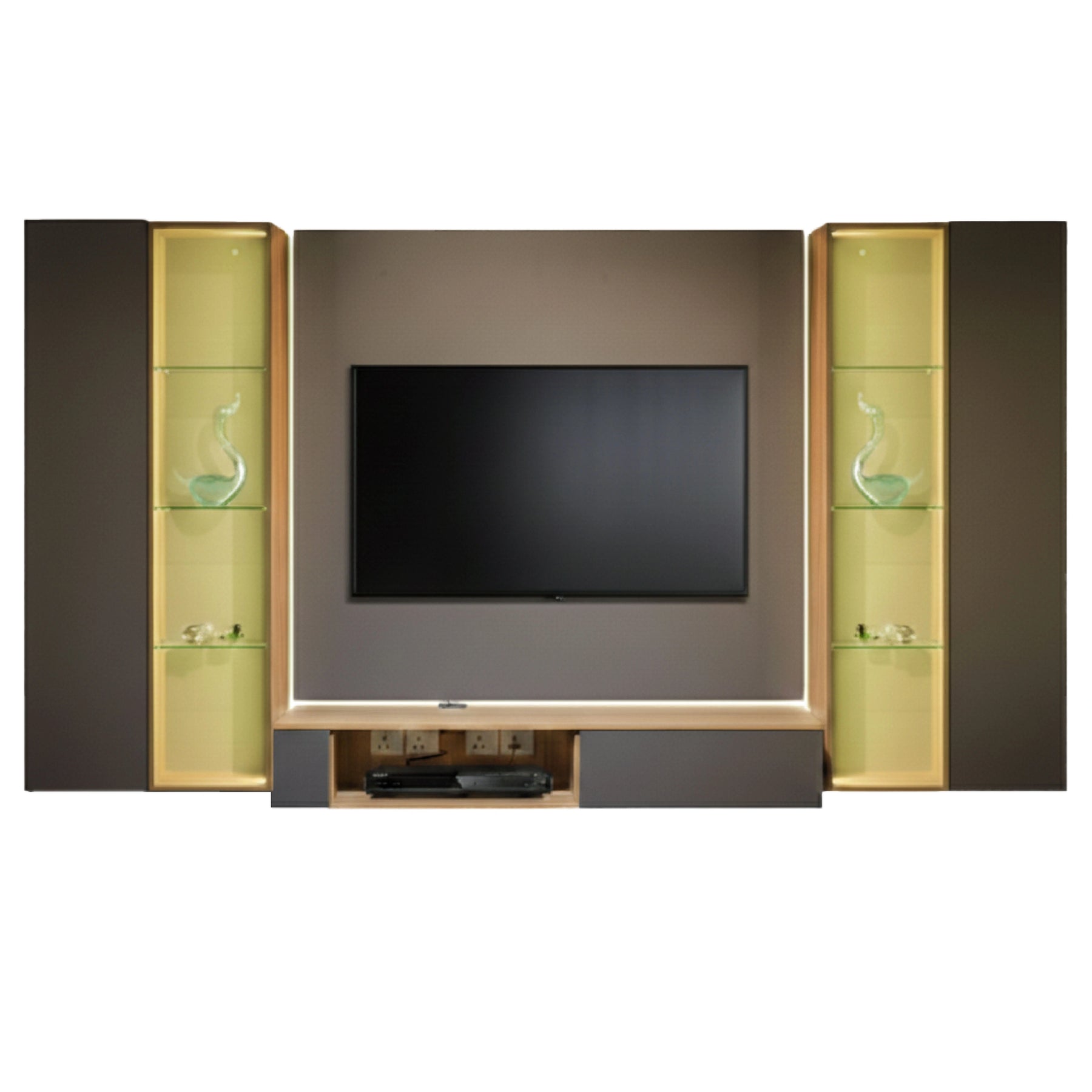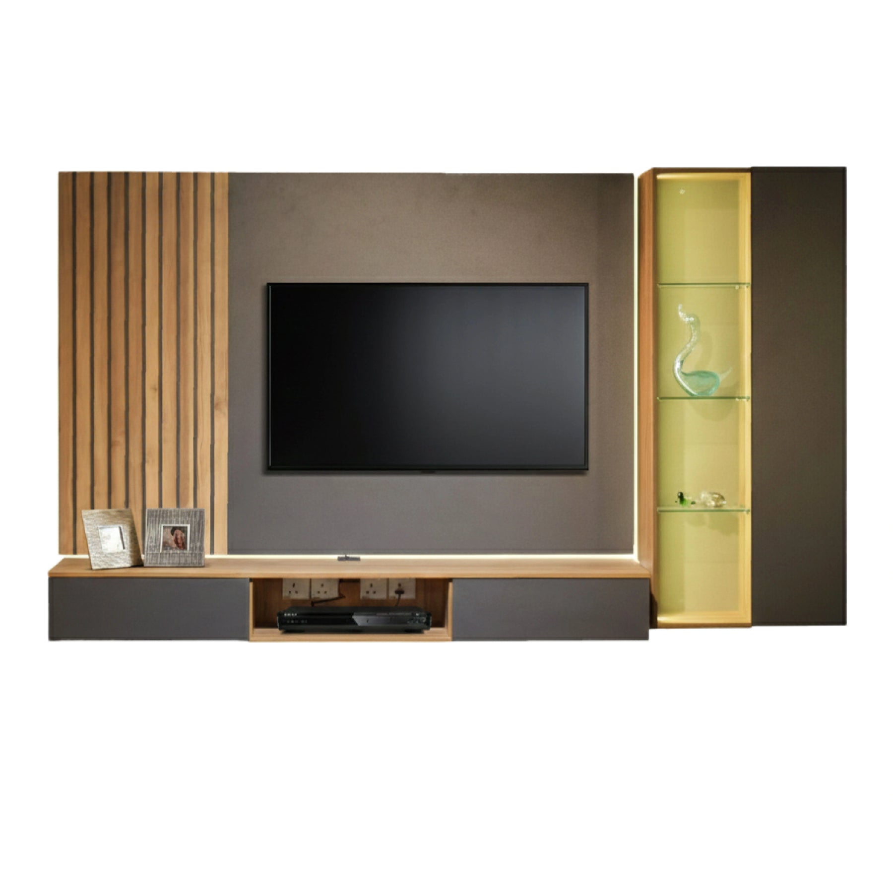 A standout feature of this cabinet is the integrated LED lighting that illuminates the slatted wall panel and open display sections, creating an inviting ambiance and highlighting your decorative pieces. The unit offers a versatile storage layout, including a spacious drawer for organized concealment and open shelving for easy access to daily essentials. Crafted from high-durability Full Melamine, the Kuro Hall Cabinet is built to withstand frequent use while maintaining its premium aesthetic.