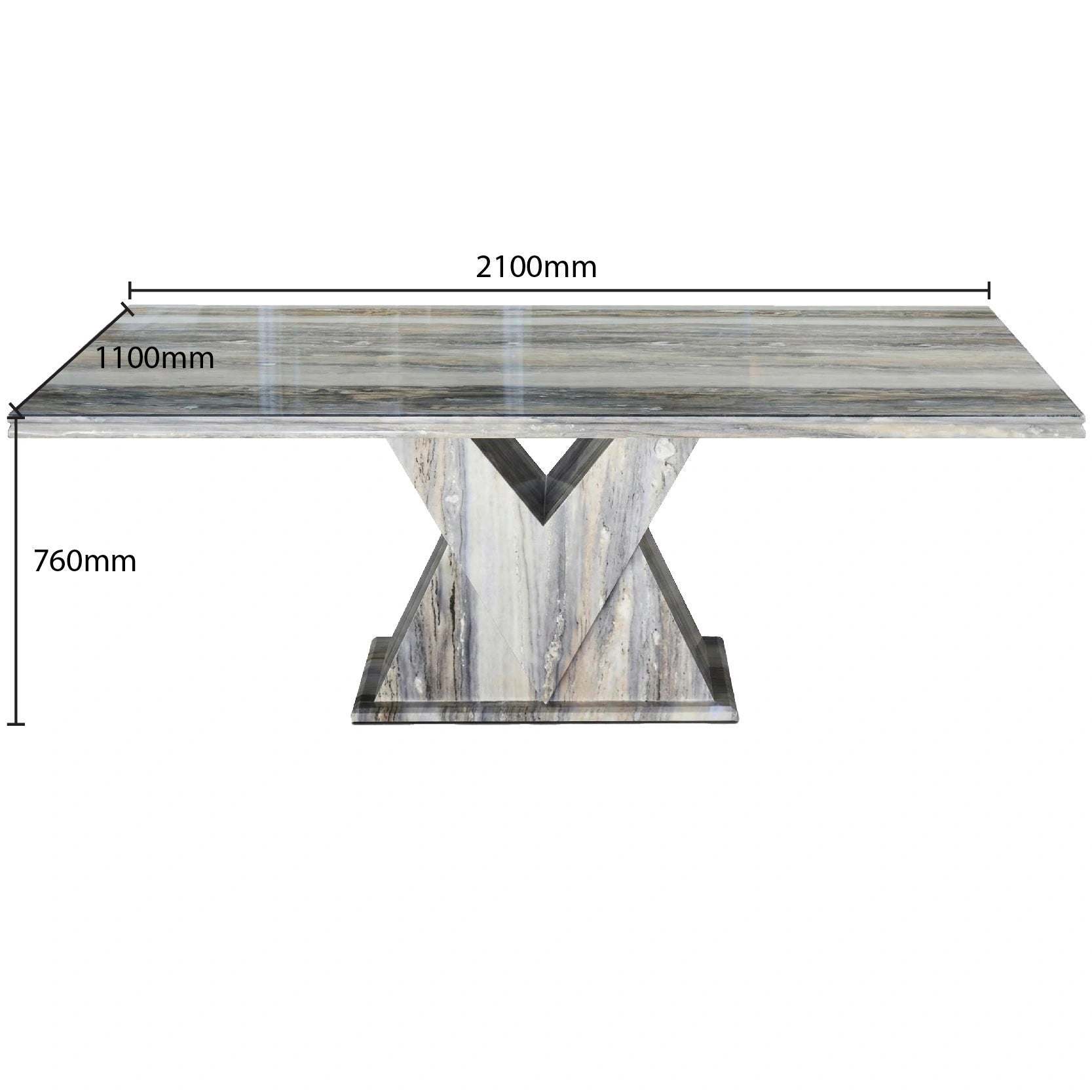 The centerpiece table features an expansive rectangular top crafted with premium Natural Marble. Its "linear-grain" surface showcases rhythmic, horizontal bands of slate grey and charcoal, supported by a robust X-frame pedestal base that continues the intricate stone texture to the floor. Surrounding the table are the Elize Dining Chairs, upholstered in a plush, midnight-black fabric. These chairs feature high-back silhouettes with diamond-tufted crystal buttoning, polished stud detailing, and a signature chrome ring pull on the reverse for a regal, high-end finish.