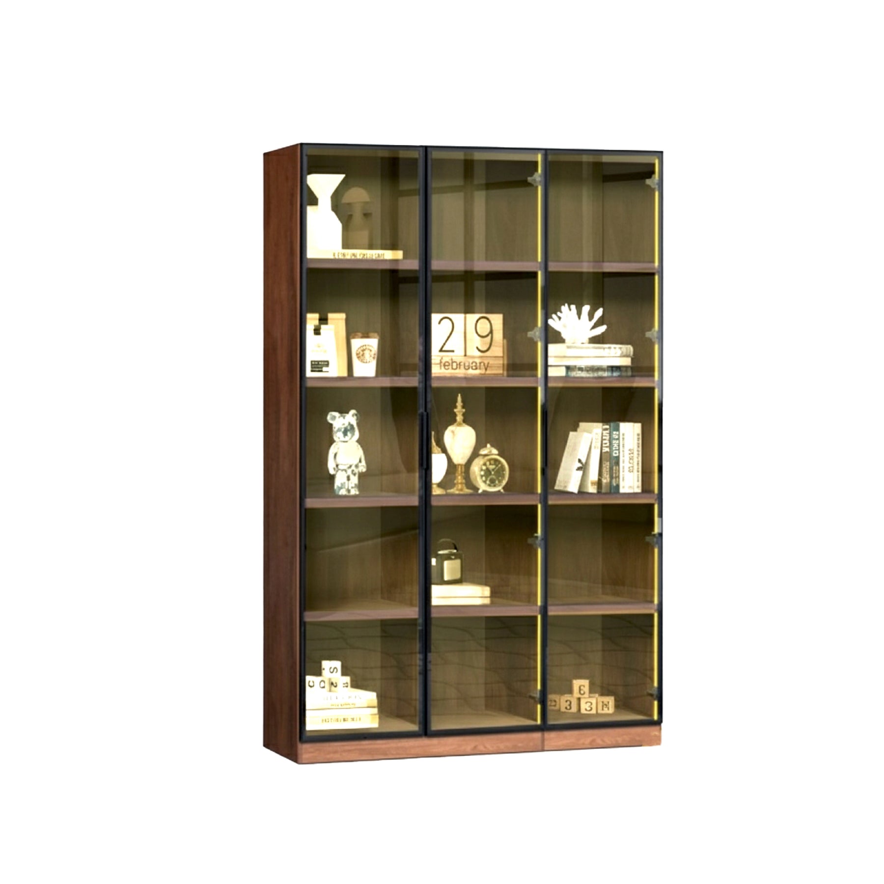 The Oslin 3 Door Display Cabinet offers a sophisticated storage solution that seamlessly blends modern materials with versatile finishes. Built on a sturdy 18mm plywood foundation, this spacious cabinet is finished in durable melamine to ensure long-lasting quality in your home. The design features three 5mm thick tempered glass doors encased in a sleek alloy frame, providing a clear and protected view of your display items