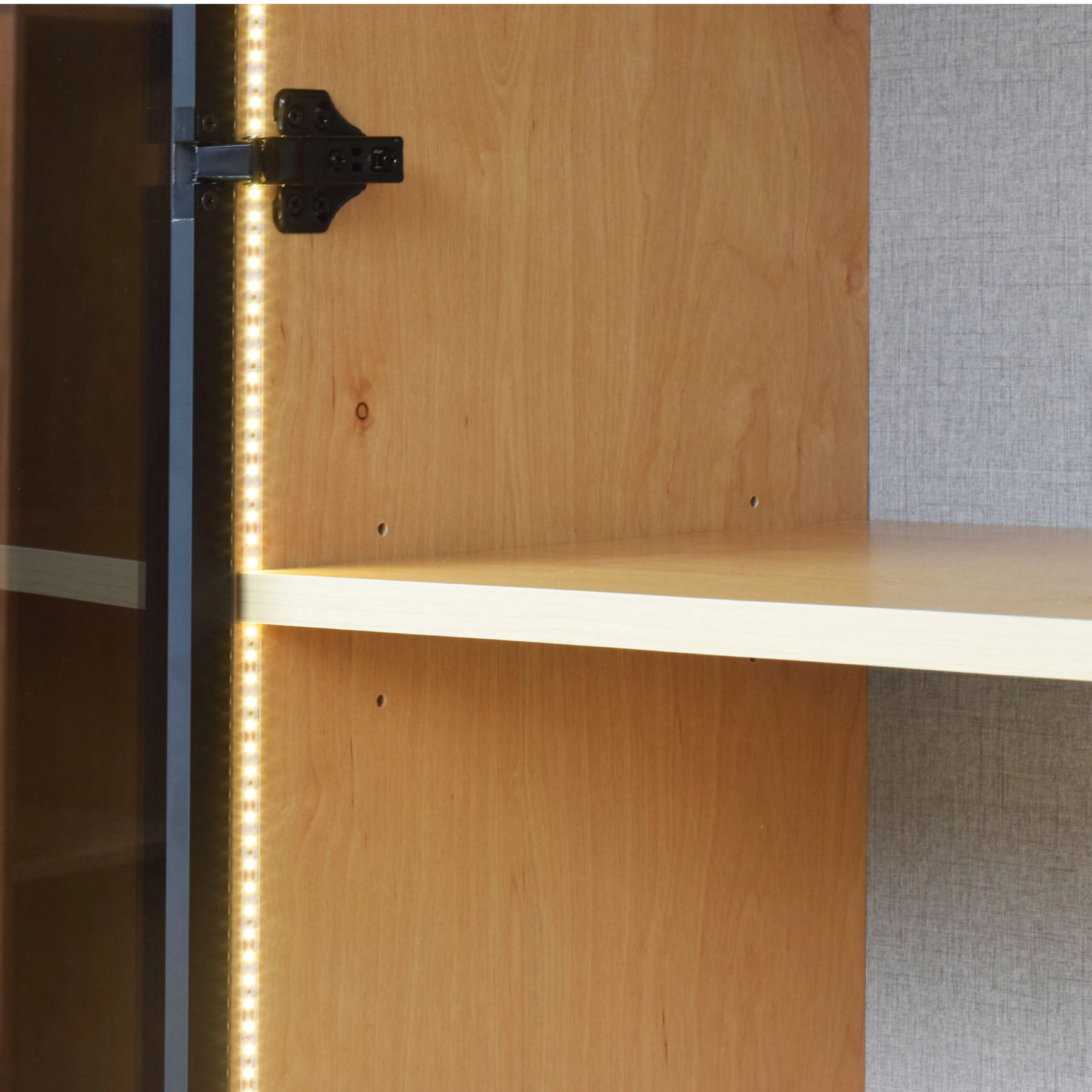 To highlight your collection, the interior is equipped with integrated LED lighting that creates a warm, ambient glow. Completed with minimalist handles, the Oslin cabinet is available in a refined palette including Cinnamon Oak, Oxford Fabric, and White, making it a perfect match for any contemporary interior.