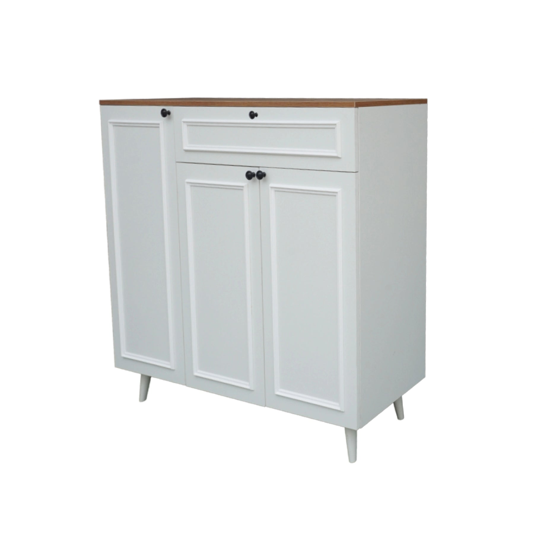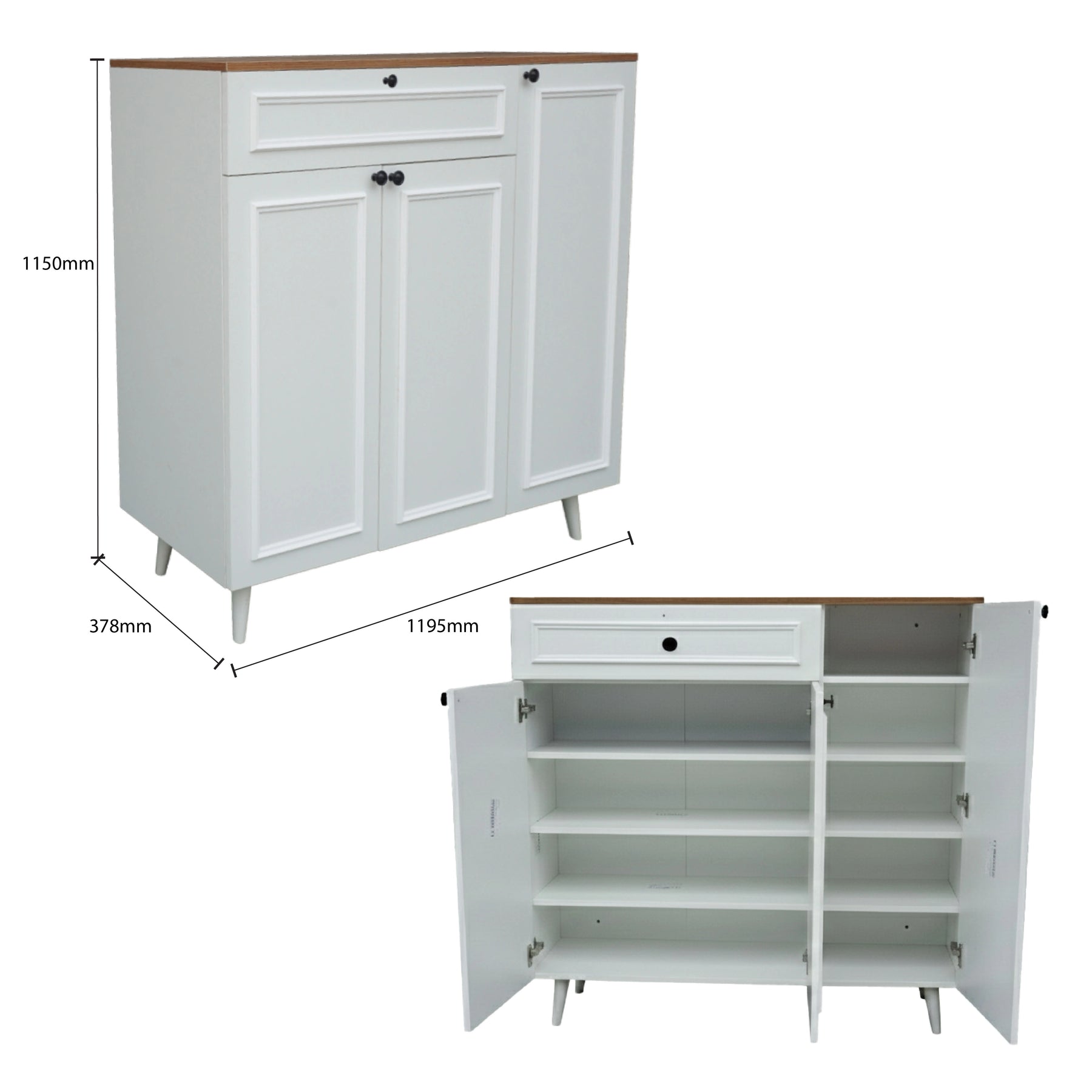 Engineered for superior organization, this triple-door unit features a spacious interior with seven tiers of shelving. The design incorporates built-in ventilation grilles at the base, which promote essential airflow to keep your footwear fresh and reduce odors. For a refined finishing touch, the doors are equipped with minimalist black round knobs and are supported by heavy-duty metal hinges for smooth, reliable operation. Crafted from high-quality Melamine, the Sola Shoe Cabinet is built for durability and ease of maintenance, ensuring it remains a staple in your home for years to come.