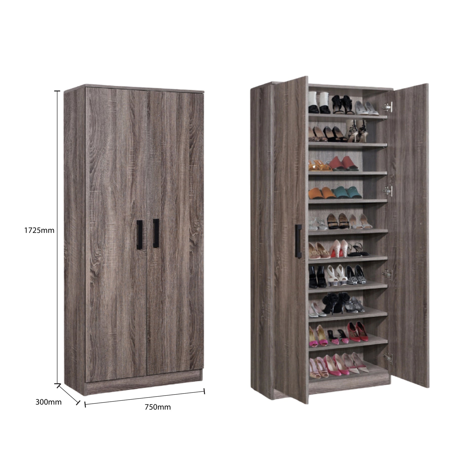 The Solea Shoe Cabinet is a sleek, vertical storage solution designed to maximize organization in homes with limited floor space. Standing at an impressive 1725mm height, its tall profile provides a high-capacity storage area while maintaining a slim 300mm depth, making it a perfect fit for narrow hallways or entryways. The cabinet features a rustic yet modern wood-grain finish that adds natural warmth to any interior decor.