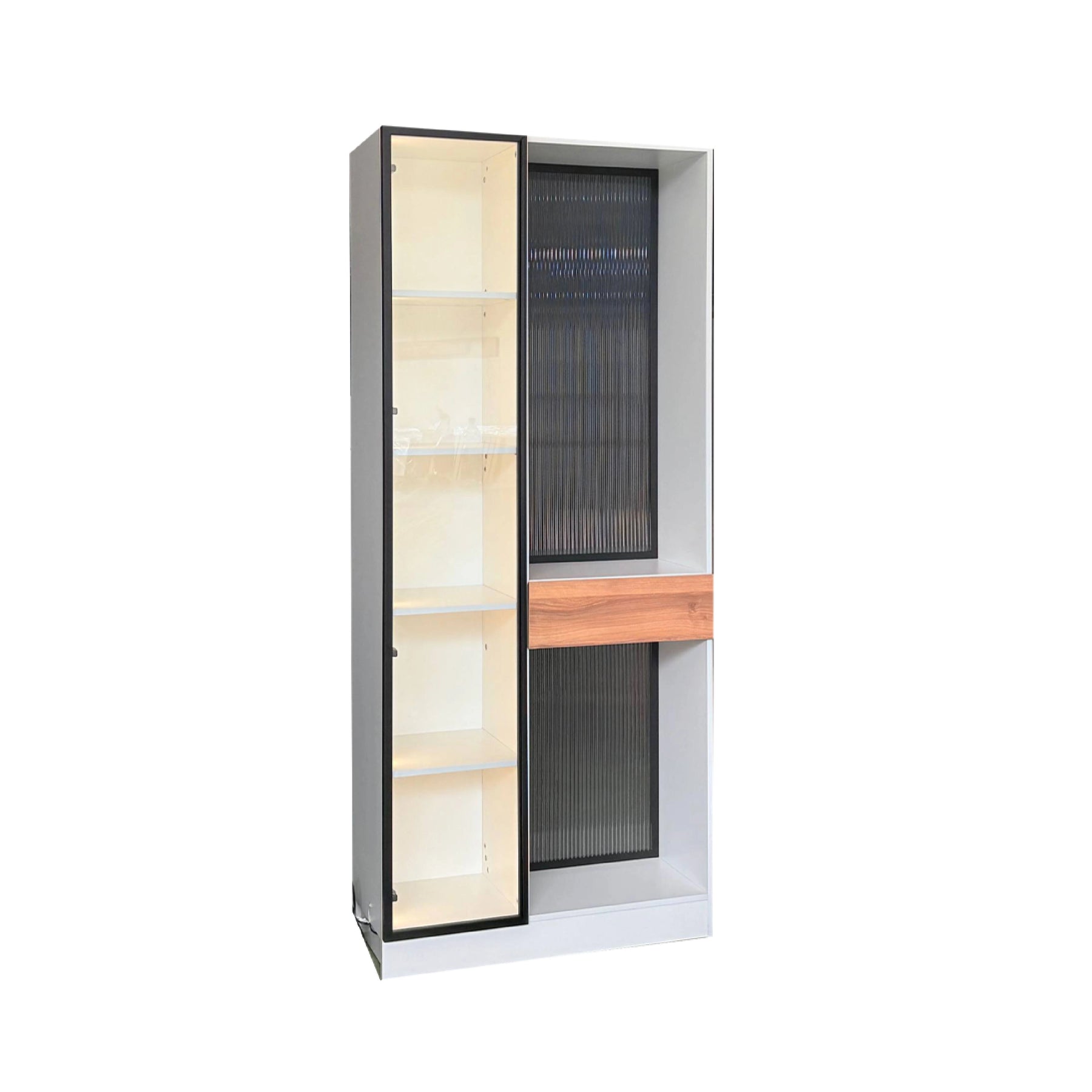 The Velmira Divider is a sophisticated architectural masterpiece designed to elevate your interior through ambient illumination and smart organization. Crafted from premium melamine, this tall unit features a stunning combination of a clean white finish accented by a rich Soleil Walnut storage drawer. Its most striking feature is the integrated LED lighting system, which runs vertically alongside clear shelving to transform your collectibles into a glowing gallery display.