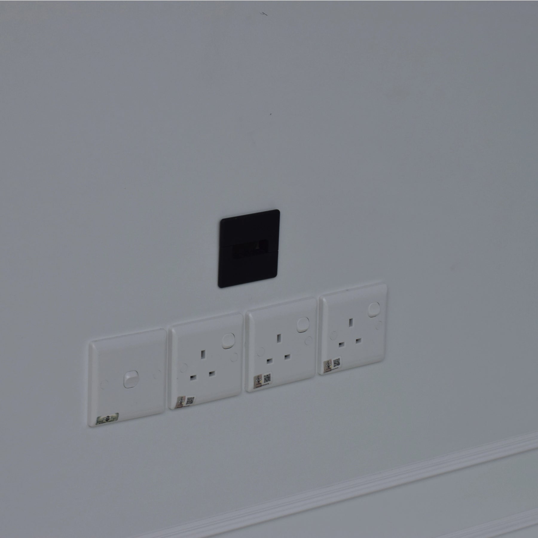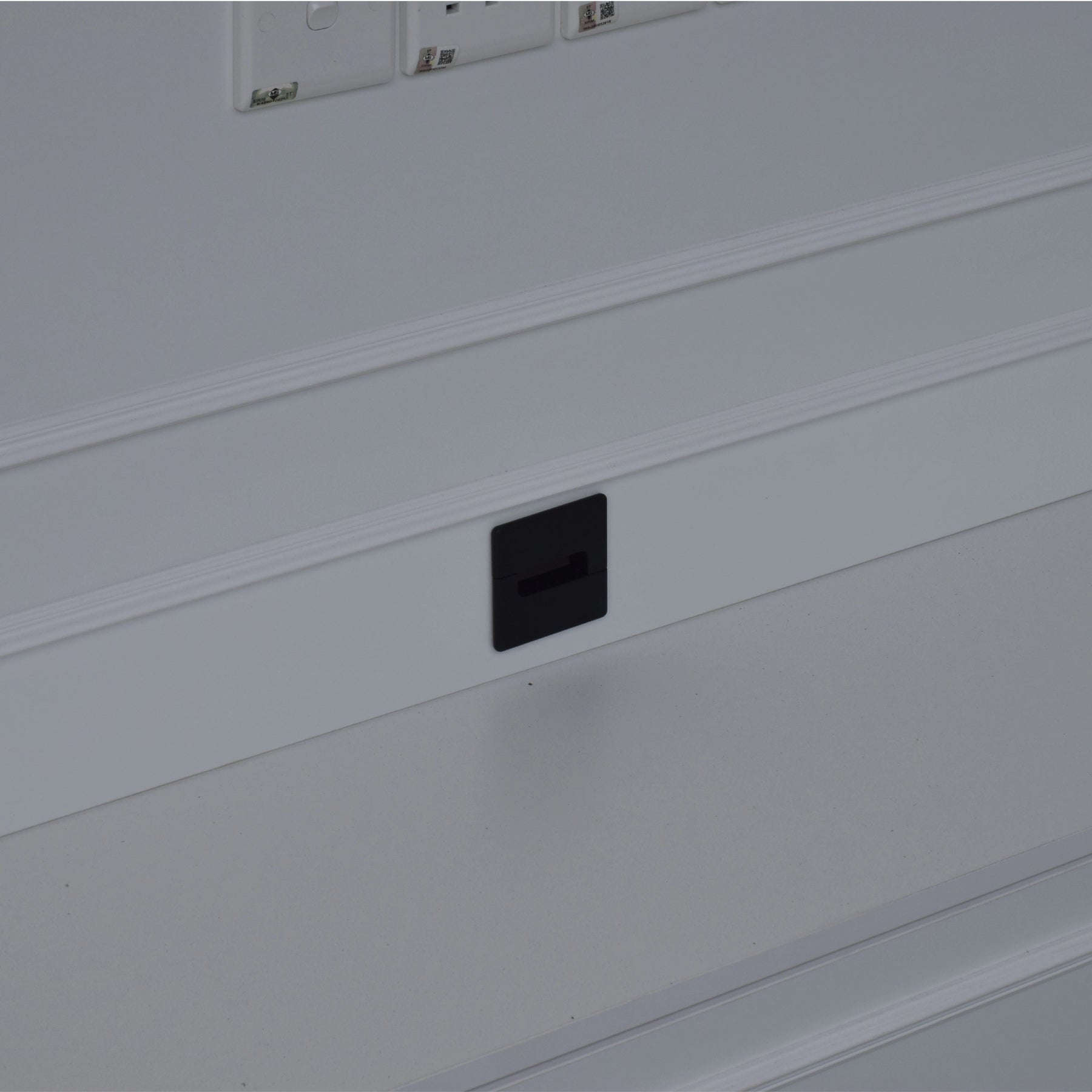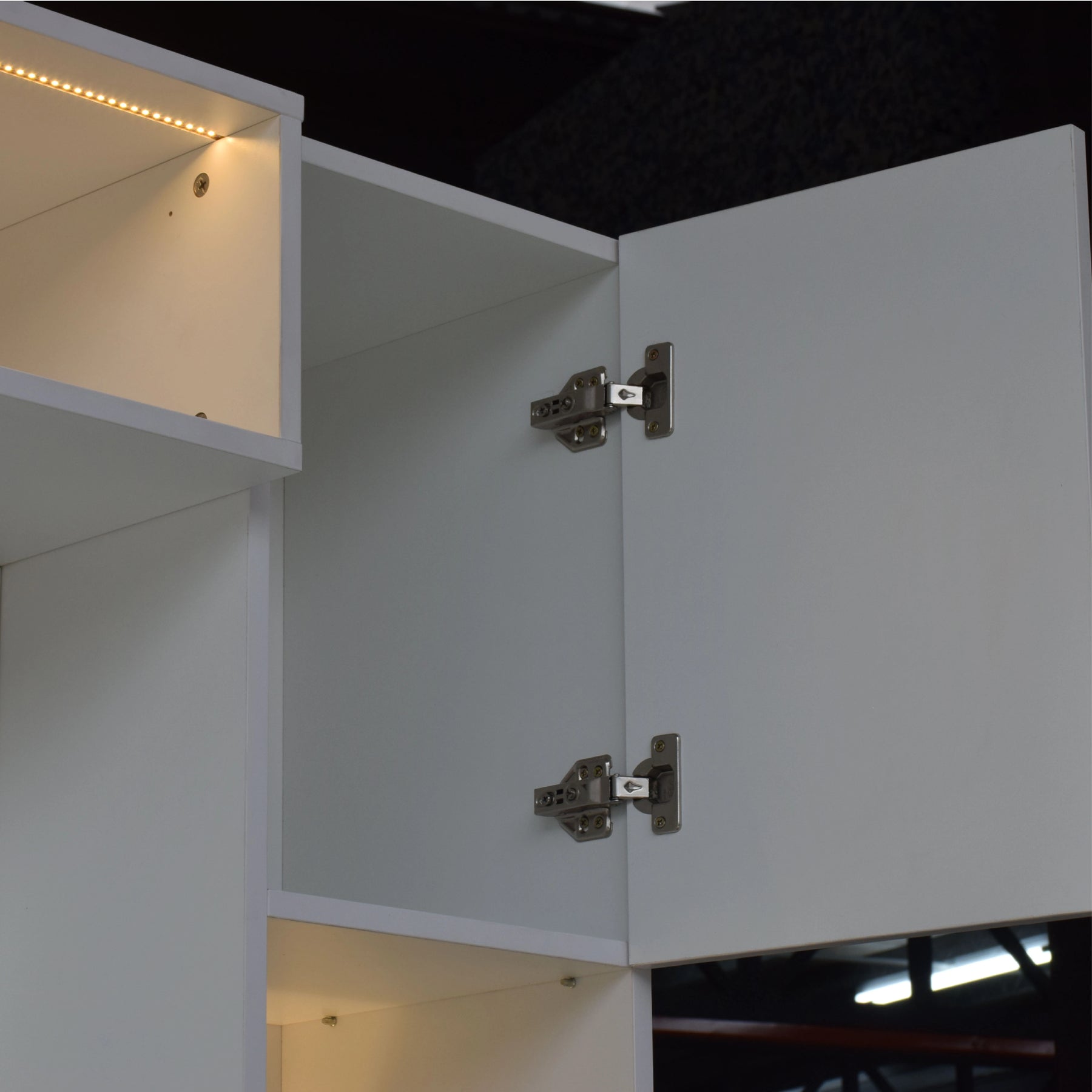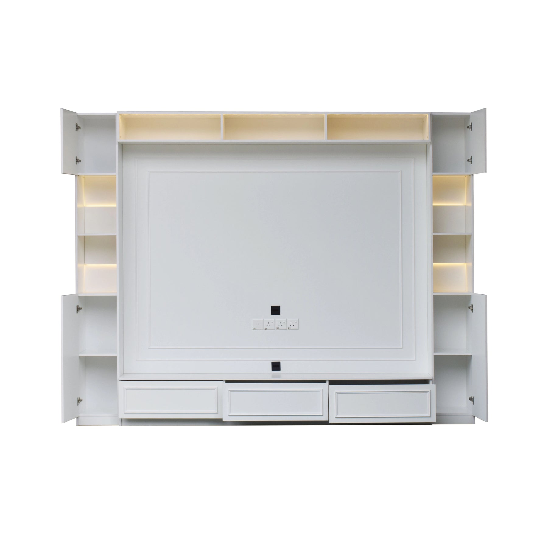 Complementing the central panel is an extensive storage network, including three overhead open bays and two full-height side towers. Each side tower features four storage compartments with integrated LED ambient lighting and glass shelving for a sophisticated display. The lower section consists of a sleek floating console with three deep, smooth-gliding drawers for concealed storage. For maximum utility, the central hub is pre-fitted with four built-in power outlets and a cable management port. Built with high-durability Melamine in a crisp white finish, this cabinet is engineered to resist scratches and daily wear.