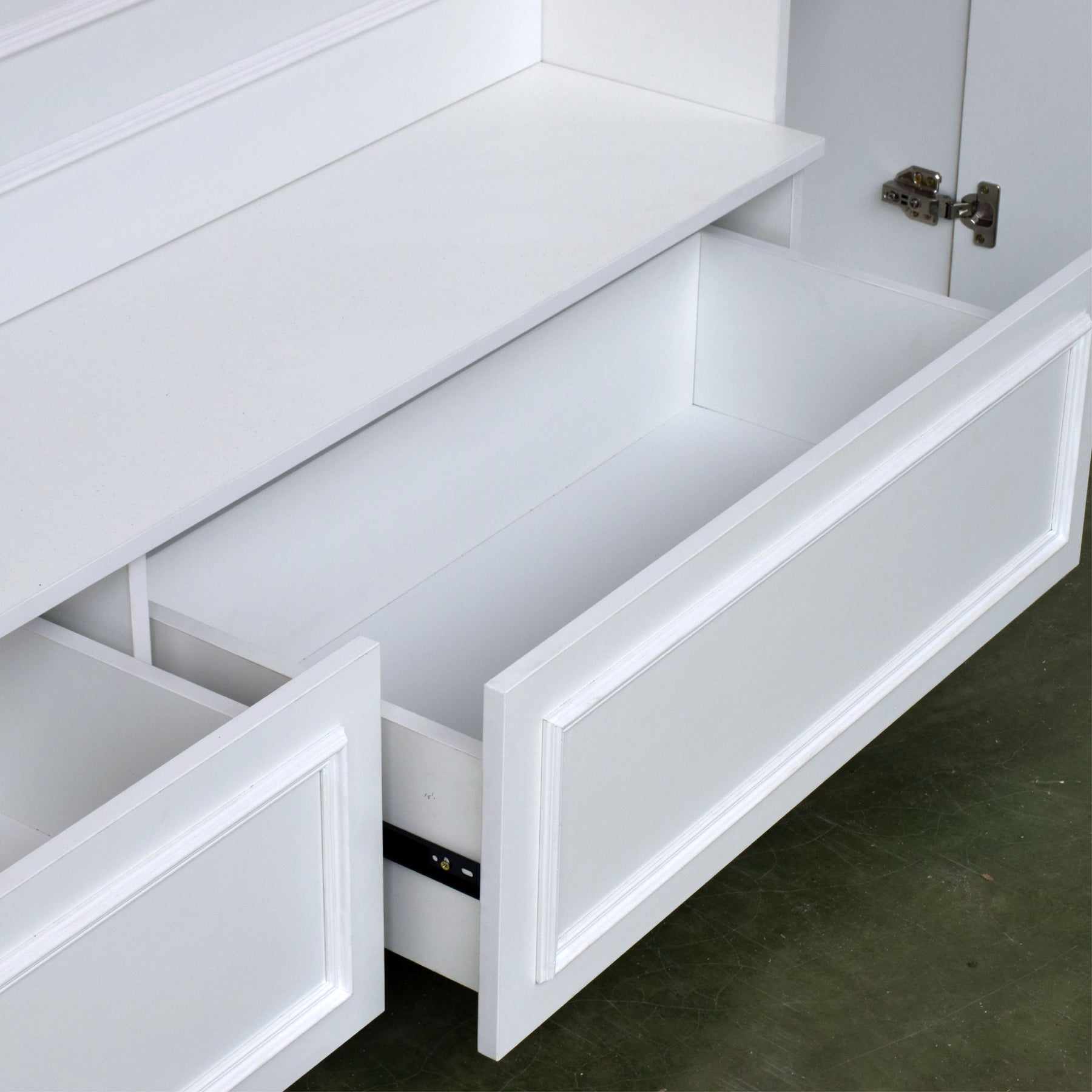 Unlike standard cabinets that use cheap EVA glue (which peels and turns black after 2 years), our furniture is finished with advanced German PUR Technology.