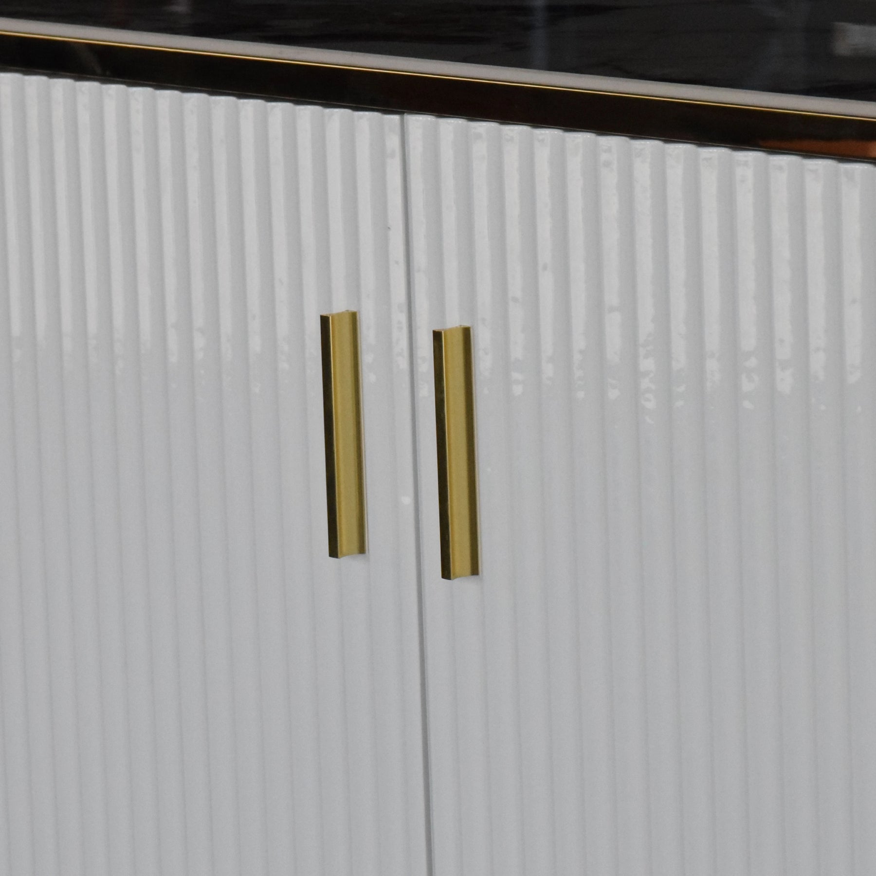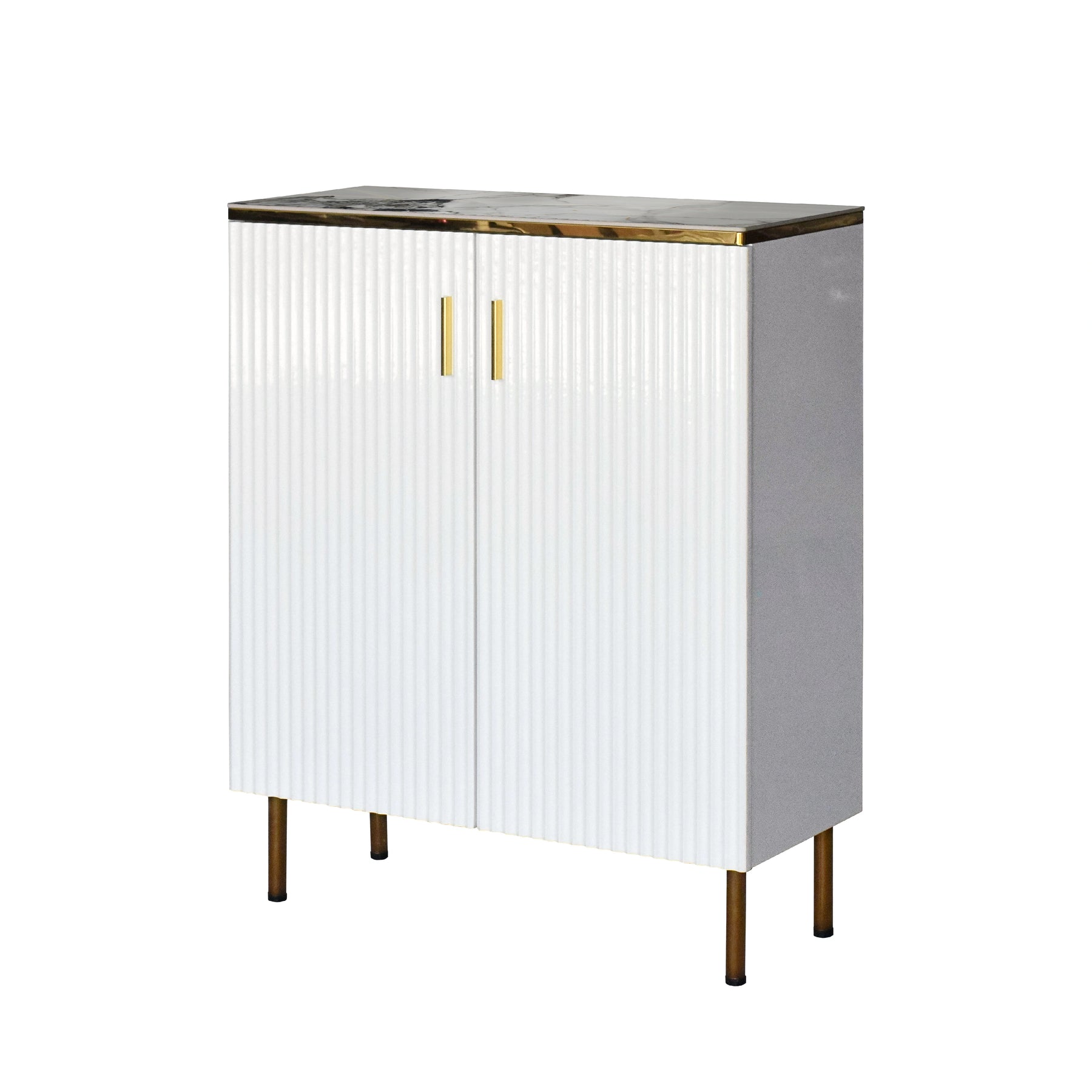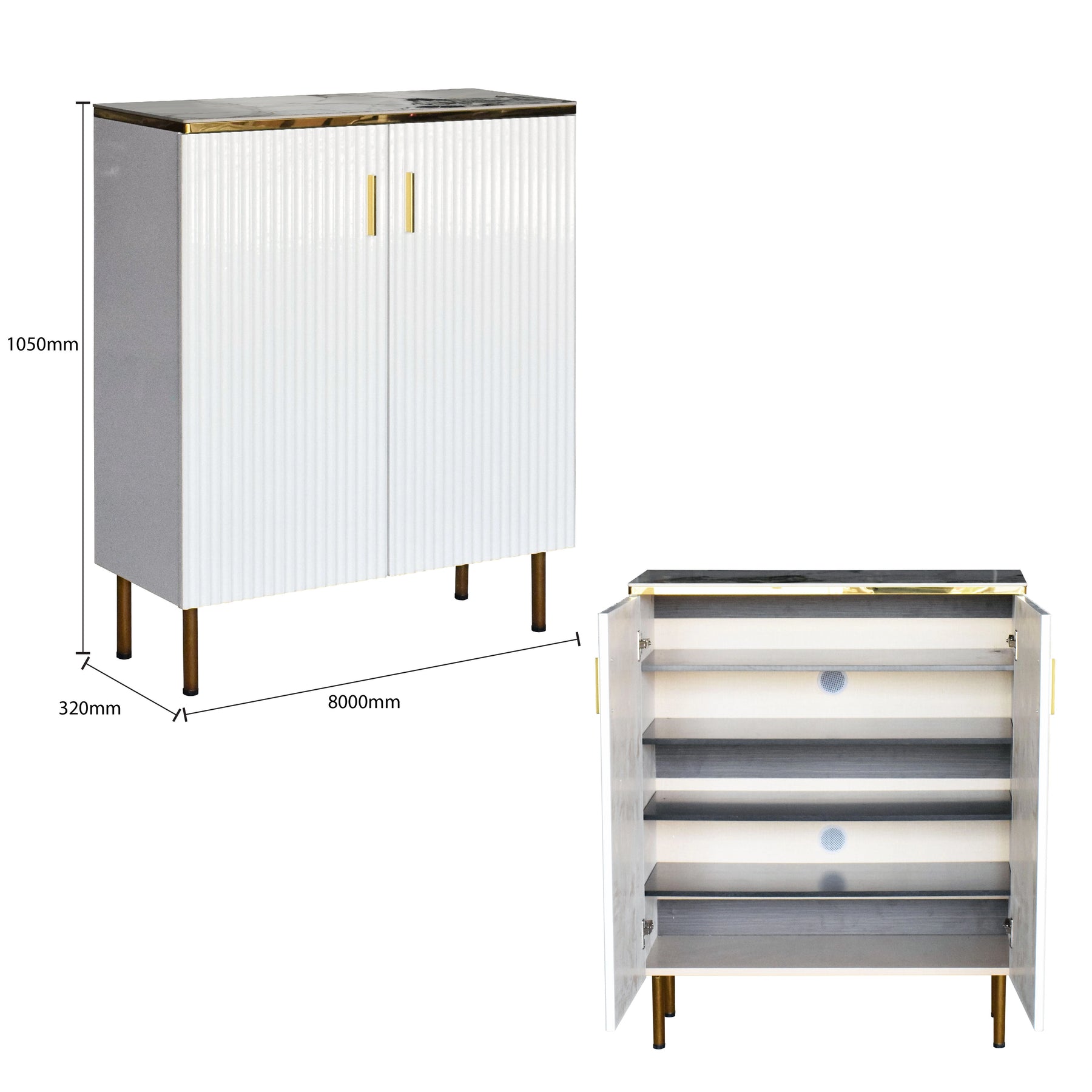 Designed for those who appreciate high-end finishes, the unit is topped with a sophisticated Sintered Stone Top, providing a durable, heat-resistant, and scratch-resistant surface perfect for displaying decor or keeping daily essentials within reach. The cabinet opens to reveal five tiers of spacious internal shelving, optimized for high-capacity organization of various footwear styles. For a minimalist look, the doors are equipped with integrated J-pull handles, maintaining a seamless and hardware-free profile. The unit is elevated by tapered gold-finish legs, which provide excellent stability and a sharp visual contrast, while also allowing for easy floor cleaning underneath.