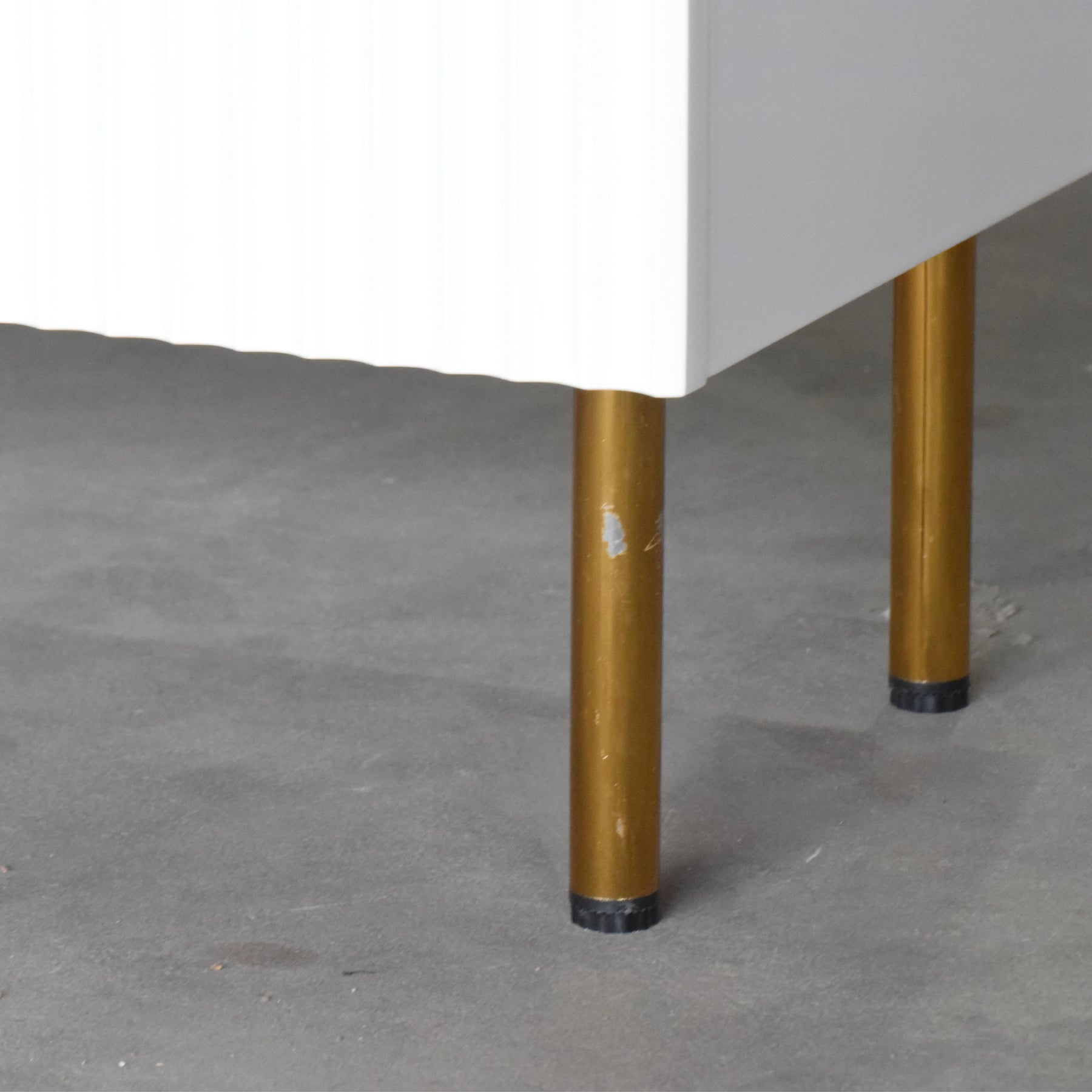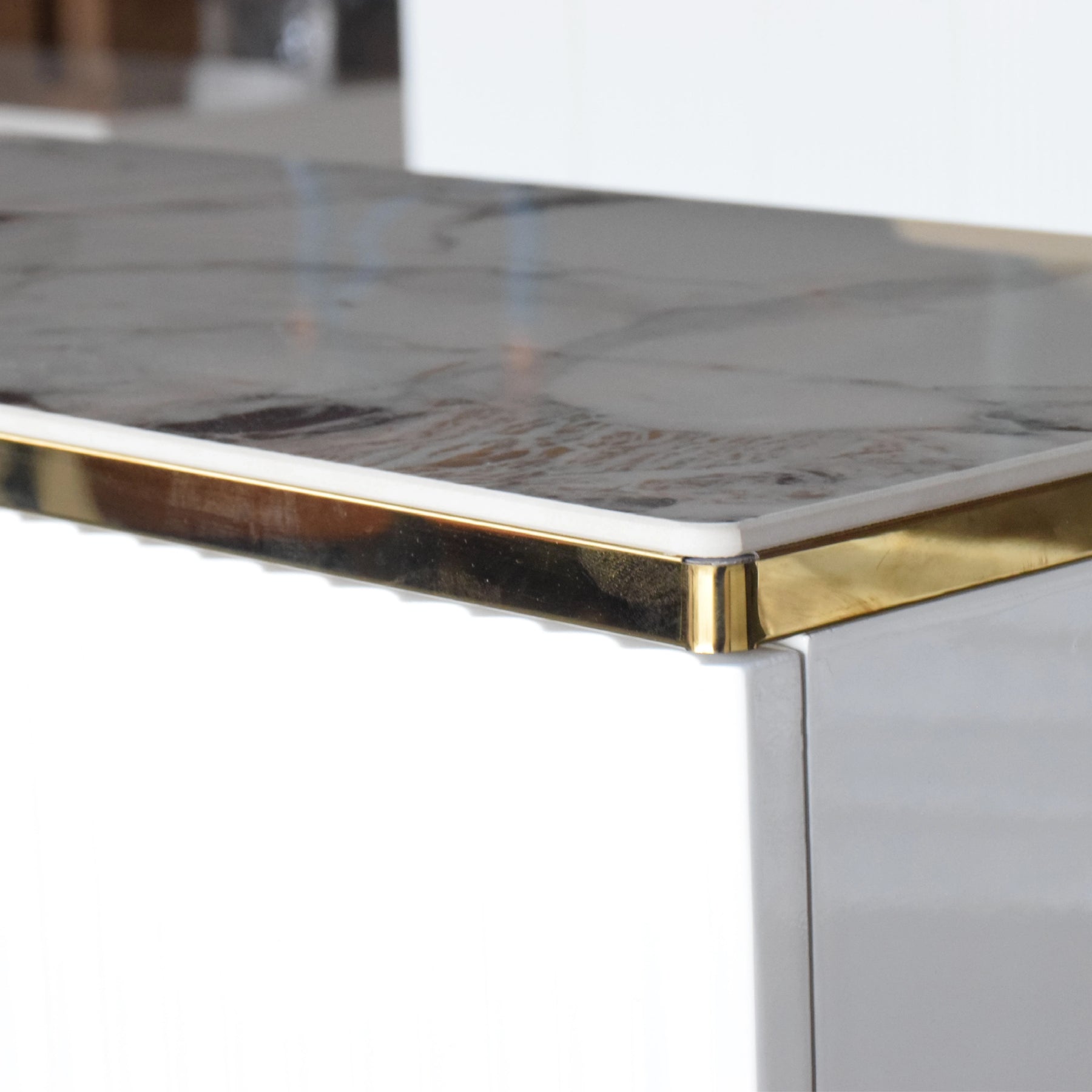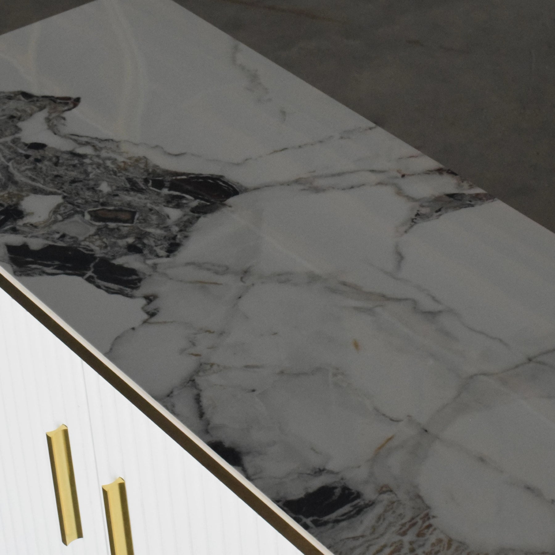 Designed for those who appreciate high-end finishes, the unit is topped with a sophisticated Sintered Stone Top, providing a durable, heat-resistant, and scratch-resistant surface perfect for displaying decor or keeping daily essentials within reach. The cabinet opens to reveal five tiers of spacious internal shelving, optimized for high-capacity organization of various footwear styles. For a minimalist look, the doors are equipped with integrated J-pull handles, maintaining a seamless and hardware-free profile. The unit is elevated by tapered gold-finish legs, which provide excellent stability and a sharp visual contrast, while also allowing for easy floor cleaning underneath.